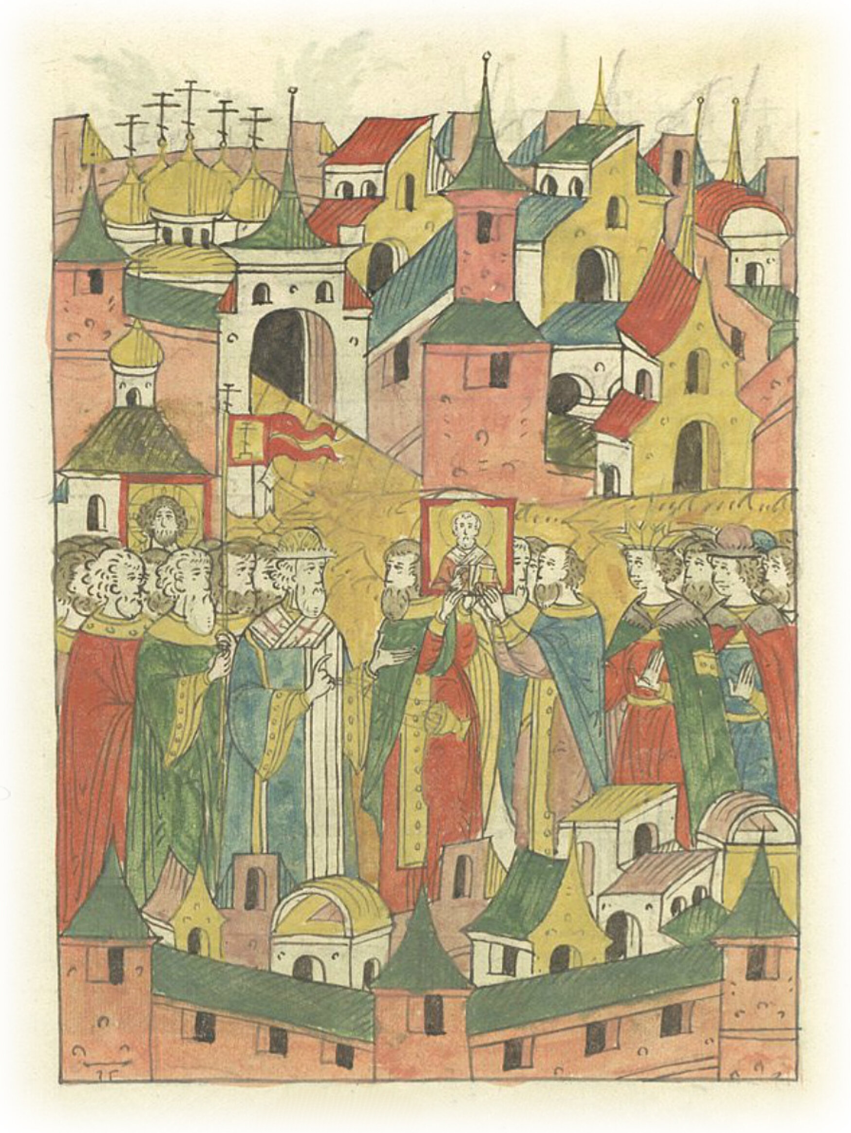 Митрополит Макарий встречает икону чудотворца Николы Великорецкого близ Фроловских ворот у Троицы.