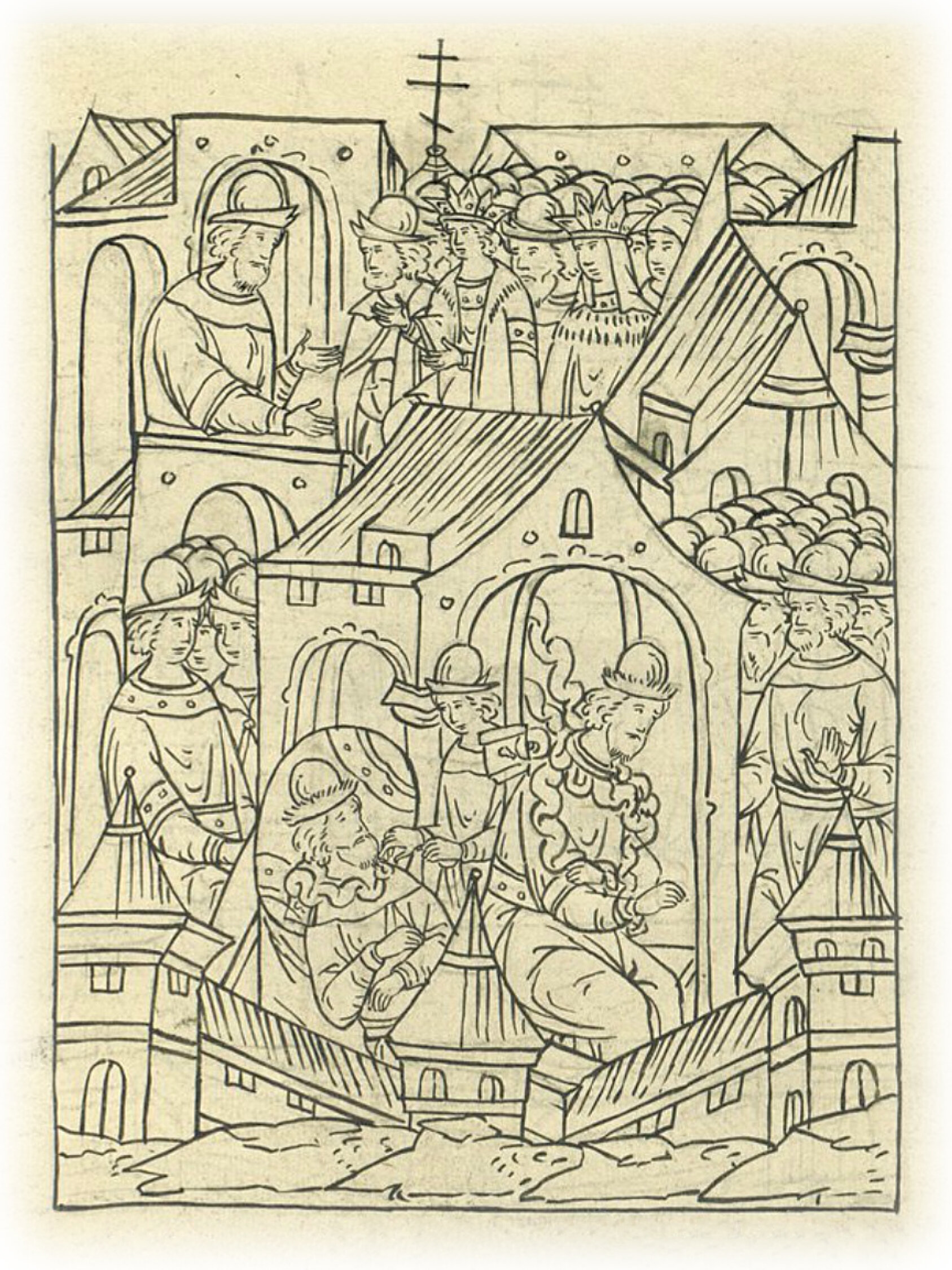 Ругодивские посадники Яким и Захар приезжают в Москву. Воеводы царя Ивана Васильевича Алексей Адашев и Иван Михайлов сообщают им, что государь пожалует их, если сдадут его воеводам помимо Ругодива Вышгород.
