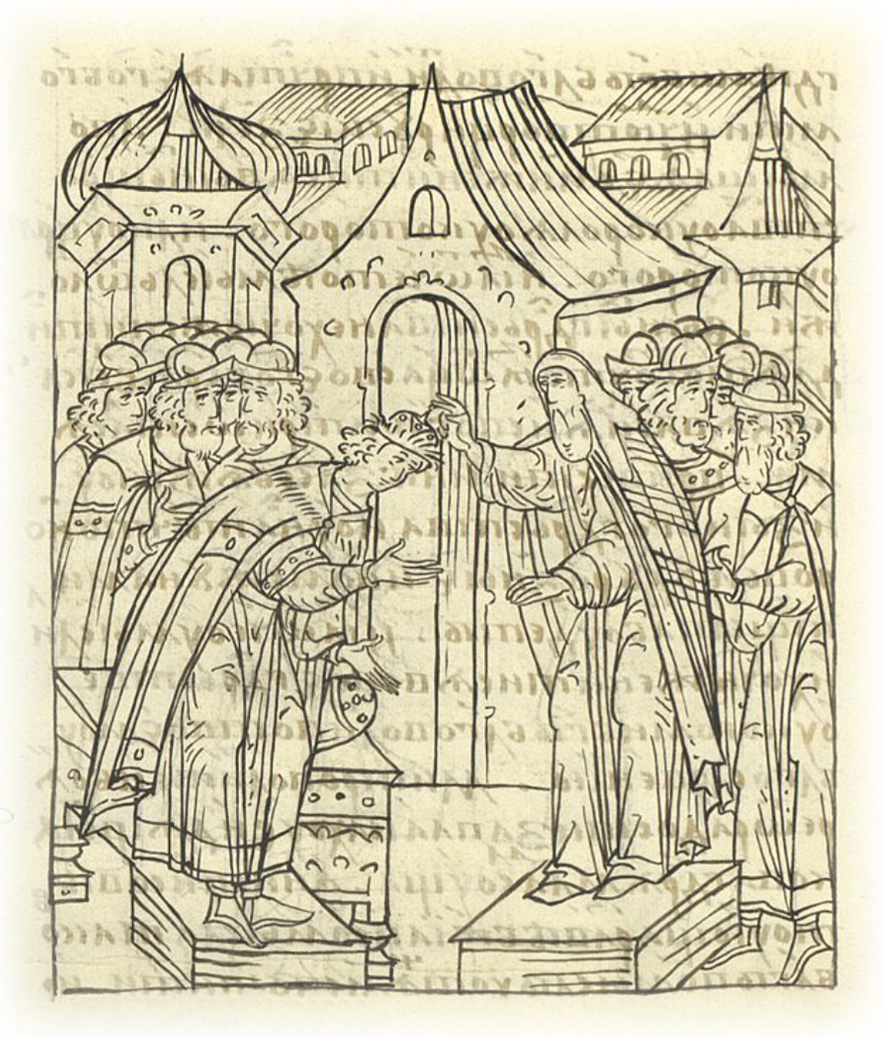 И тут же великий князь начал говорить богомольцу и своему отцу митрополиту Макарию и своим боярам: «По твоему, своего отца митрополита, благословению и с вашего боярского совета хочу я перед своей женитьбой поискать чинопоследование прежних своих прародителей: как наши прародители, цари и великие князья, и родственник наш великий князь Владимир Всеволодович Мономах на царство, на великое княжение садились, так и я так же то чинопоследование хочу совершить и на царство, на великое княжение хочу сесть. И ты, господин, отец мой митрополит Макарий, благослови меня то дело совершить». И митрополит Макарий, услышав это от государя великого князя, благословил его поискать чинопоследования его прежних прародителей, и на царство, на великое княжение благословил сесть; а бояре, то услышав, возрадовались, что государь еще в таком младенчестве, а чинопоследования своих прародителей, великих царей и великих князей, поискал.