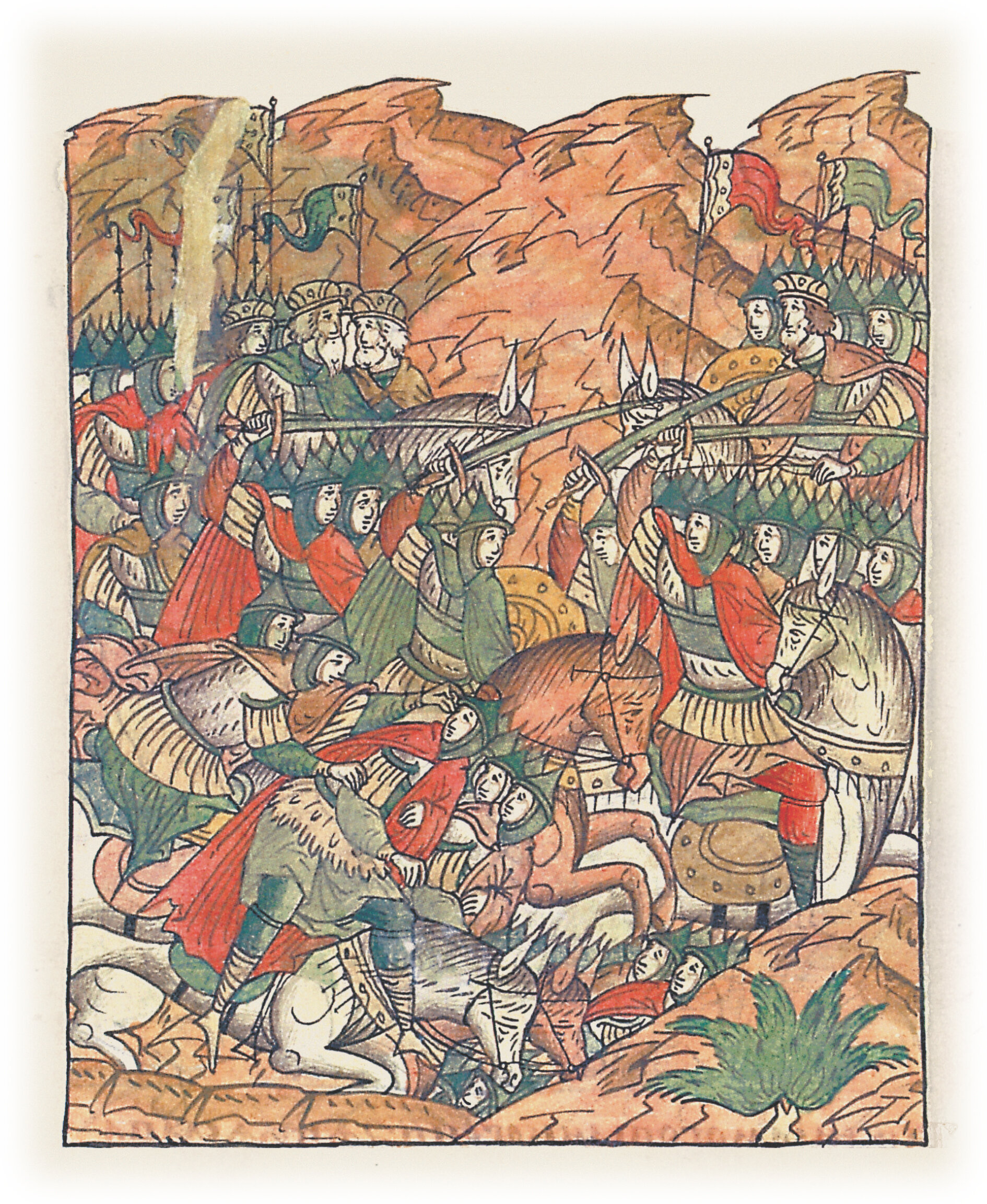Огромное войско князей Мстислава Изяславича, Ростислава Мстиславича и союзников идет на Изяслава Давыдовича. Он бежит, но его догоняют.