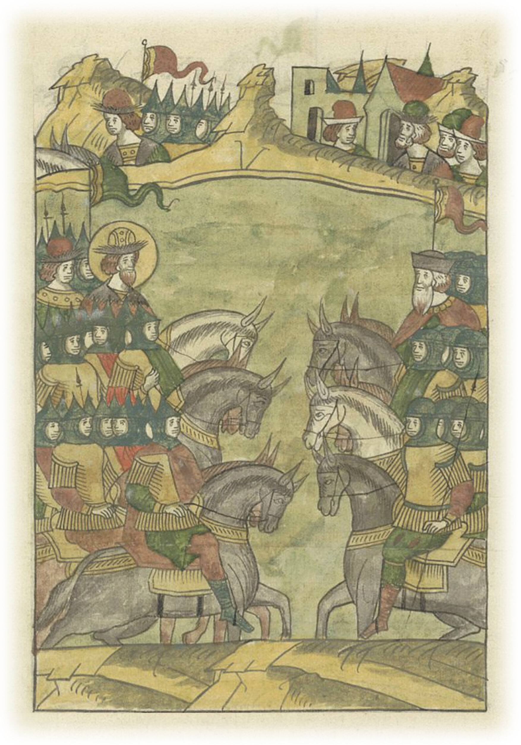 укрепился силою крестною, и, ополчившись, пошел на них. И сошлись они на озере Чудском, и было огромное множество обоих полков. Отец же его, великий князь Ярослав Всеволодович, прислал ему на помощь брата его меньшего, князя Андрея, с множеством воинов своих. И у великого князя Александра было также множество храбрецов, как в древности у царя Давида, сильных и крепких.