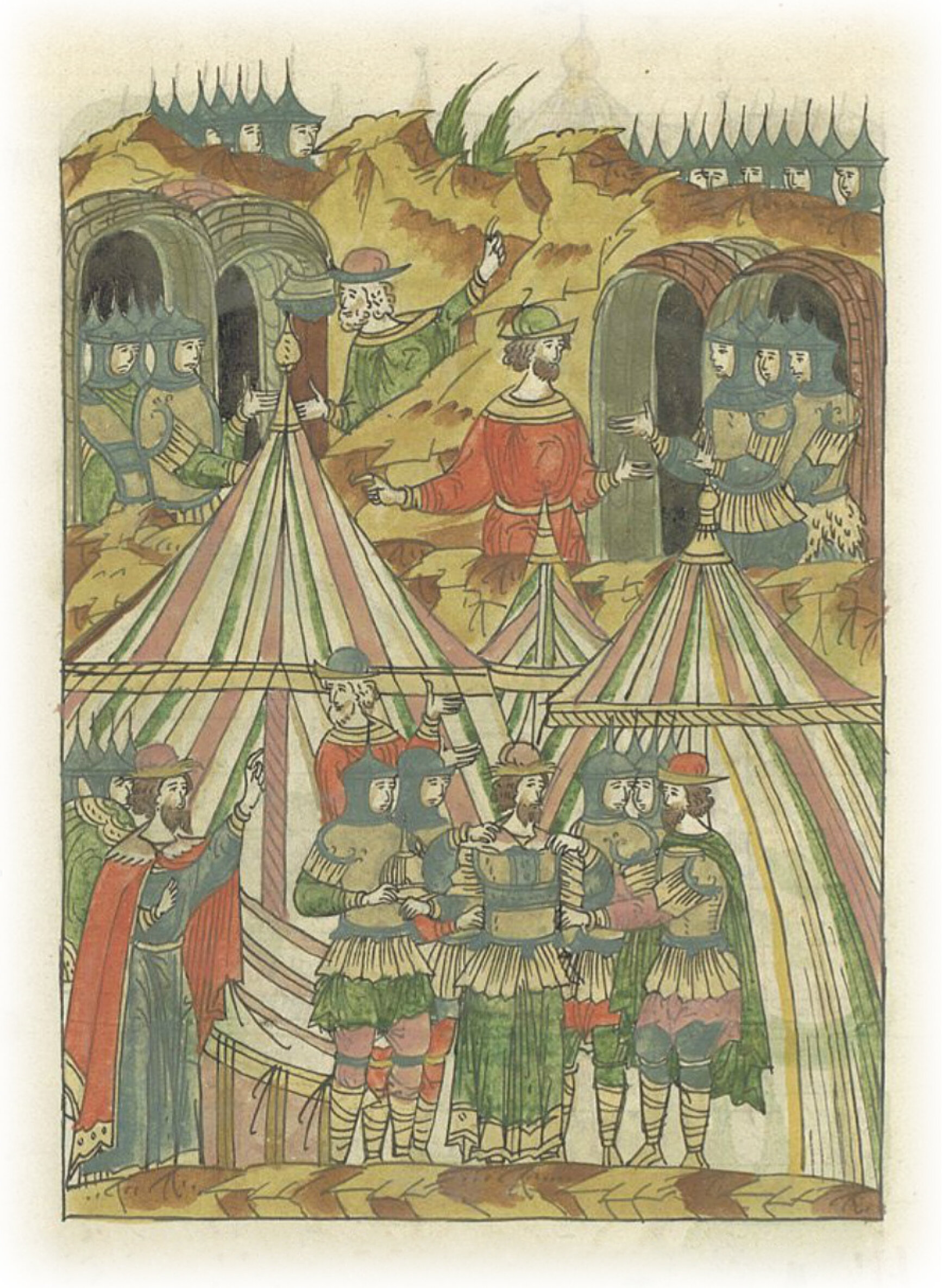 Он же начал по всем станам рассылать гонцов, а сам тотчас начал на себя одевать доспехи