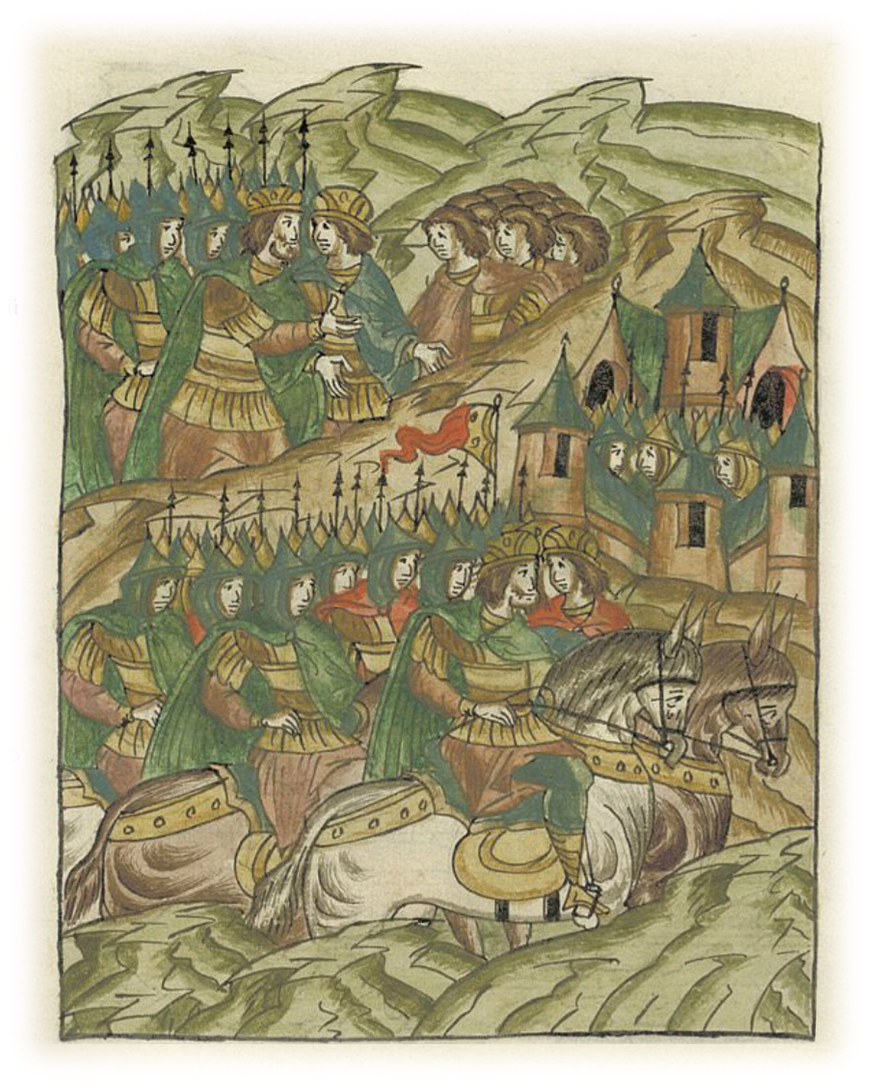 Всеволод Юрьевич советуется со своими братьями и берет половцев с собой к большому болгарскому городу, где они стоят два дня.