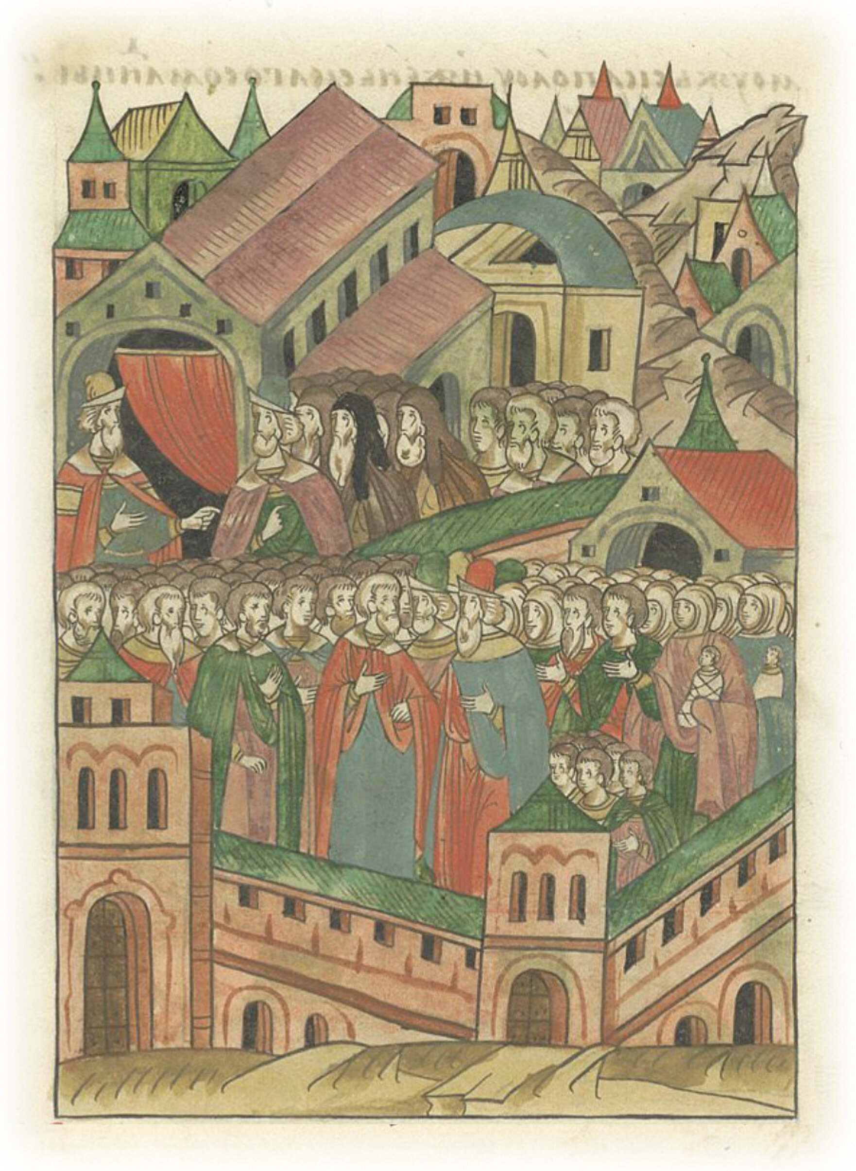 И много было беженцев, (которые) сбежались из волостей иных городов, и много их собралось в то время, и иностранные бояре, и сурожане, и суконники, и прочие купцы, и архимандриты, и игумены, и протопопы, пресвитеры и дьяконы, и черноризцы, и всякого возраста (люди) мужского пола и женского с младенцами.