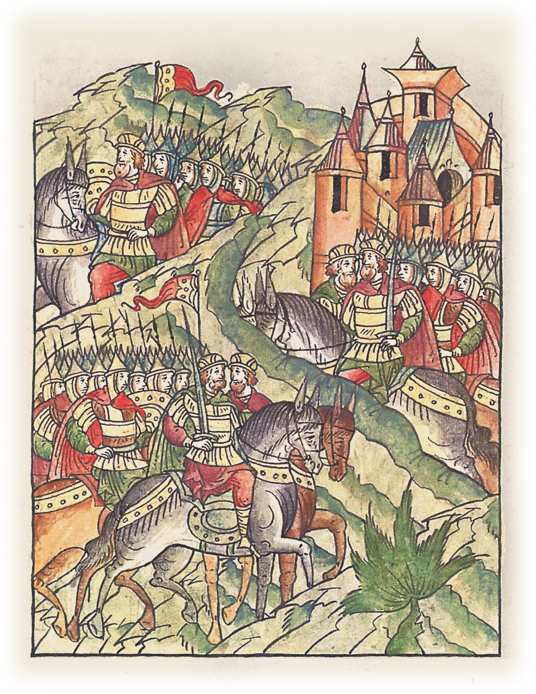 Языки говорят воеводам царя Ивана Васильевича, что магистр окопался большим рвом вокруг города Рындола, бьет из пушек и пищалей и приступает к Рындолу.