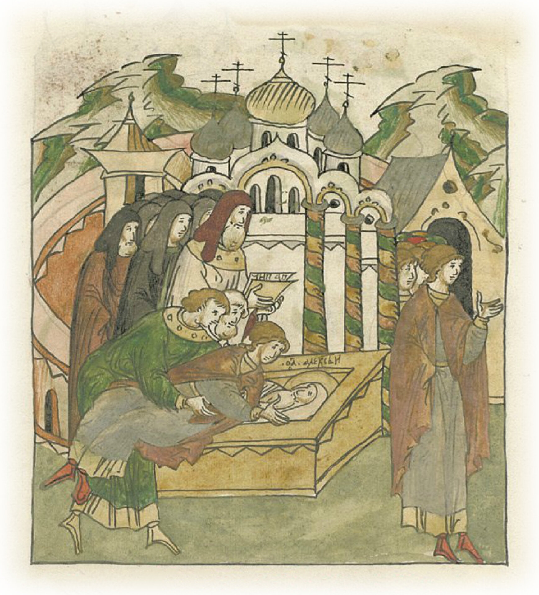 О чудесах святого Алексия чудотворца. Тем же летом в месяце июле в 13 день принесли из села некую девицу, именем Анну, христианскую дочь, с расслабленными ногами, которая пребывала в том недуге лежащей семь лет. И приложили ее к чудотворной раке, где лежит тело святителя Алексия, и молитвами святого исцелилась, стала здоровой и ушла.