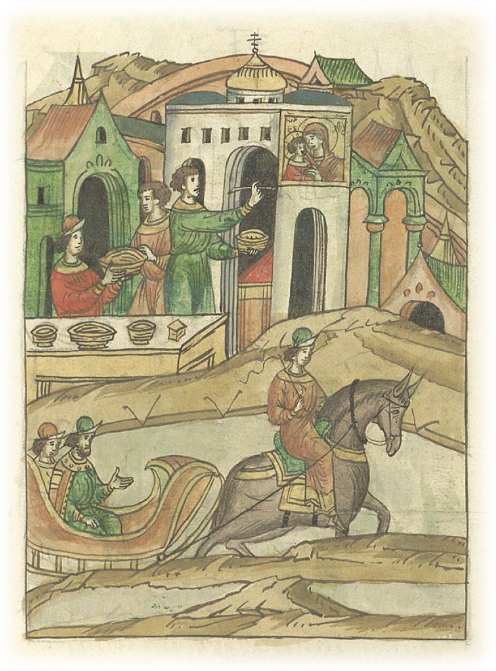 Лед на реке Волхов в Великом Новгороде стоит до марта. Засуха весной. Роспись церкви Пречистой Богородицы на Лисьей горе в Новгороде.