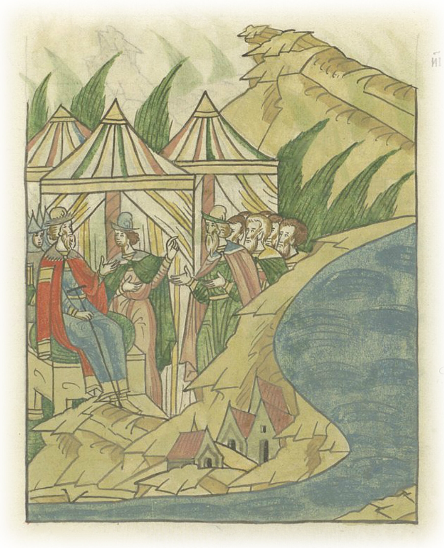 А князь Василий Феодорович Шуйский, воевода псковский, с посадниками прочими и с лучшими людьми после своих послов пришел к великому князю туда же на устье Шелоны.