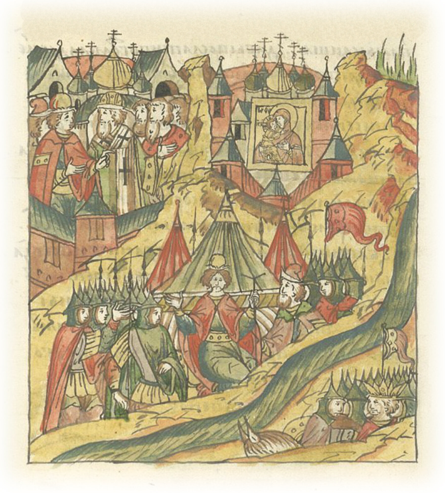 О призвании чудотворной иконы Богоматери. Преблагой и премилостивый Христос Бог наш, когда слышит обращение к Нему людей своих, всегда бывает рядом с призывающими Его. И, как захотел Сам и пренепорочная Его Мать владычица, (восприняв) богоугодные молитвы угодников своих, дал благой совет. Божиим хотением великий князь Василий воспринял его, хотя и был на далеком расстоянии, на берегу великой реки Оки, и митрополит Киприан, который был в это время Москве. Но, благодаря Богу, им в голову пришла одна и та же мысль: послать в город Владимир за чудотворной иконой Богоматери, которую написал евангелист Лука, чтобы принесли ее в царствующий город Москву. Они уповали на то, что владычица и госпожа пречистая Богоматерь своим пришествием к смиренным и скорбящим может переменить печаль на радость и избавит от всякого зла ныне и навсегда. И с такой верой и надеждой возвестили любезные Богу свои помыслы князьям, боярам и прочим, которые были с ними (там, где каждый из них находился). И понравилось это богоугодное дело всем.