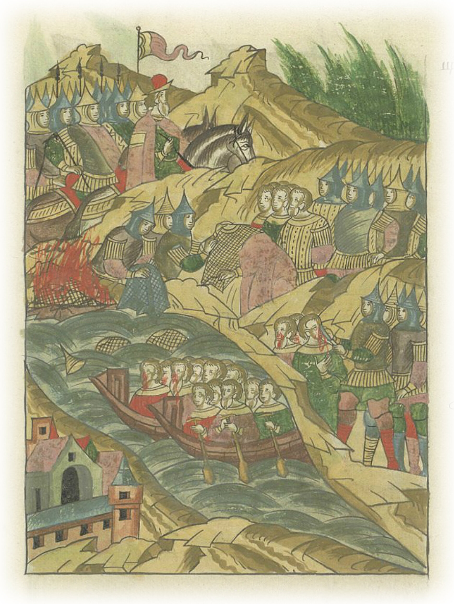 И этим пойманным повелели самим себе носы и губы резать, и отпустили их назад к Новгороду; а доспехи с них, сняв, в воду побросали, а иные огню предали, ибо не было им в них нужды, так как своих доспехов достаточно было.