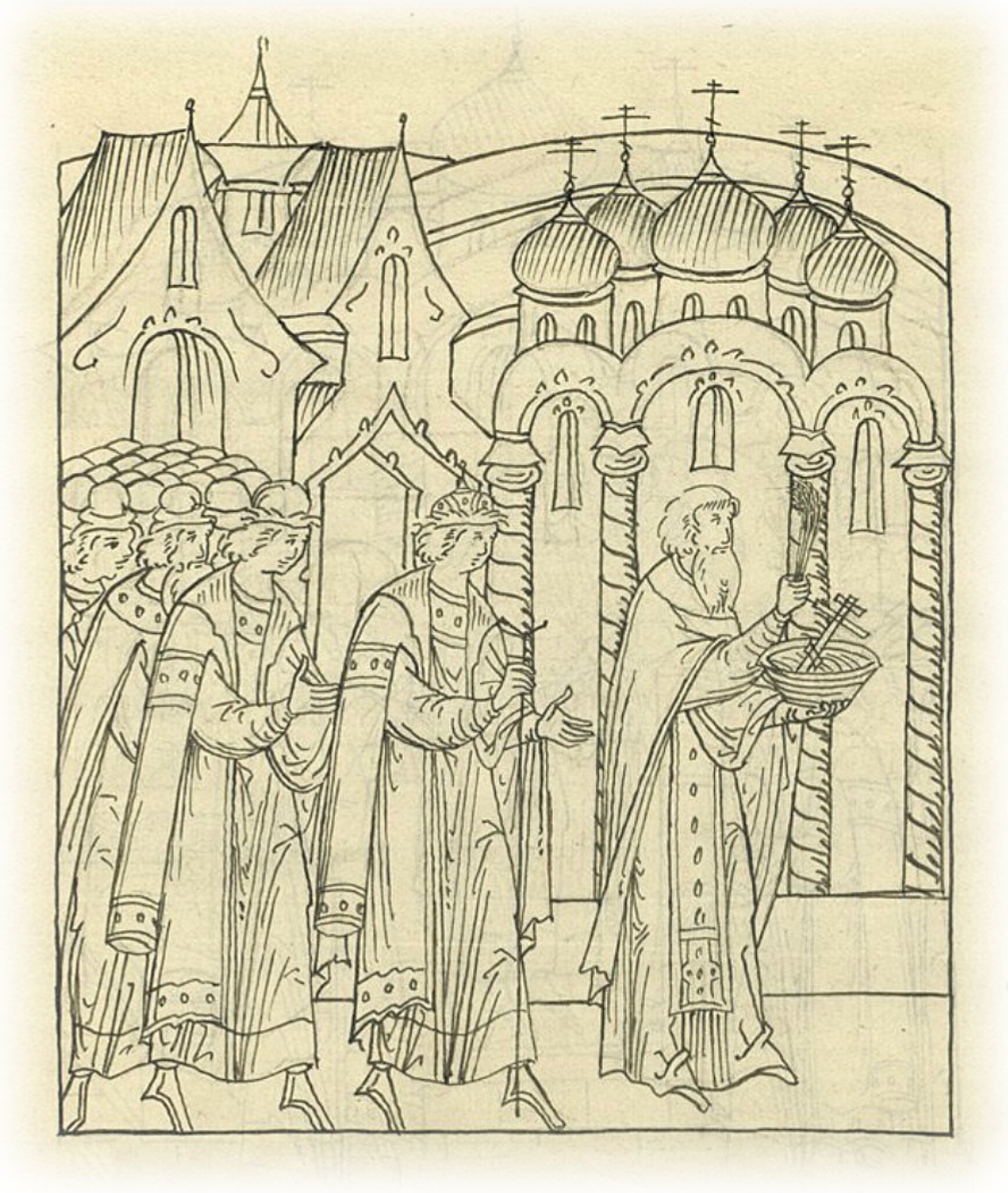 И после того спустя полчаса вышел великий князь из Столовой брусяной избы и пошел по царскому своему чину к Успенской соборной церкви; а перед ними шел его духовник Благовещенский протопоп с крестом и святой водой и кропил крестообразно до соборной церкви; а за великим князем шел его брат князь Юрий Васильевич, и бояре, и княжата, и боярские дети.