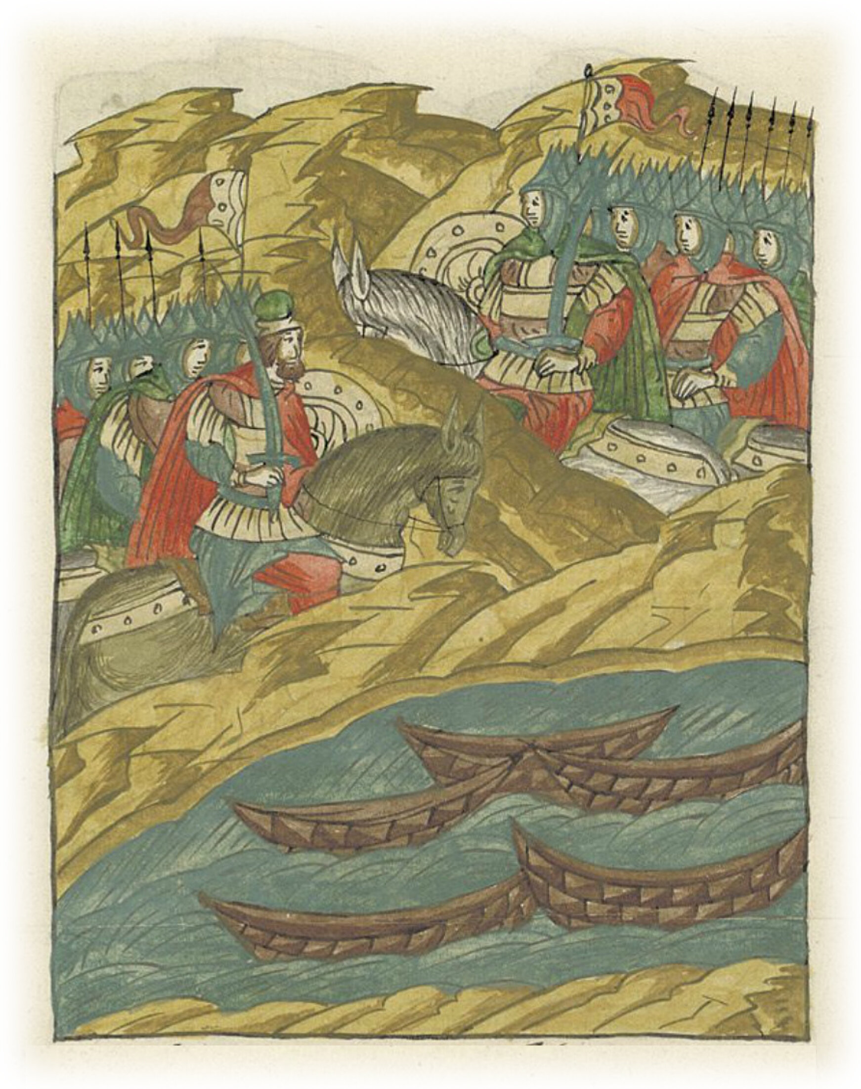 Подойдя близко к ладьям, болгары устремились на бой, белозерцы же, Божьей помощью укрепившись, начали сражаться с ними.