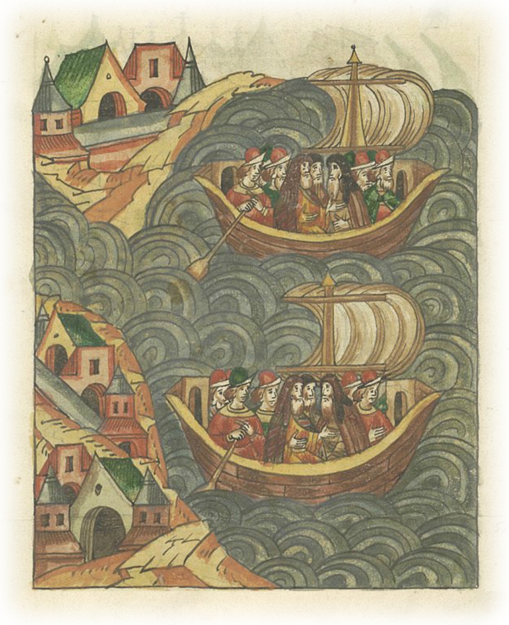 О походе митрополита Пимена в Царьград со Смоленским владыкой Михаилом и Спасским архимандритом Сергием. Чернецы митрополита Пимена и епископов минуют Риву и Фонарь.