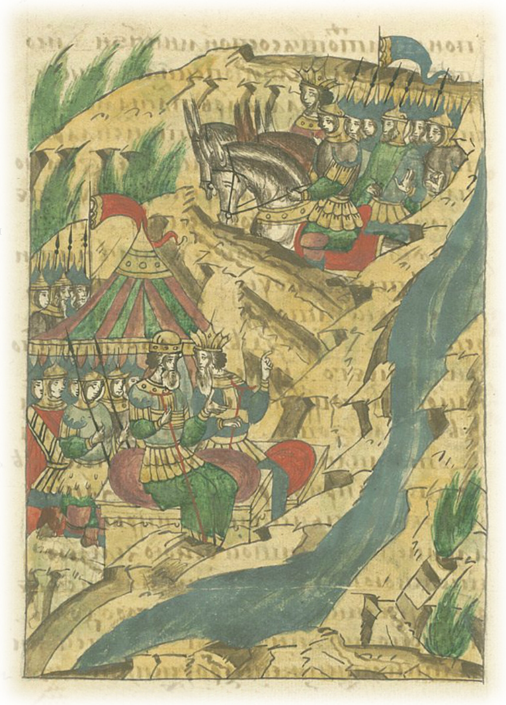 И пришли, и стали на берегу реки Ворсклы. А напротив них стал царь Темир-Кутлуй со всей силой татарской, придя им навстречу из-за реки Ворсклы.