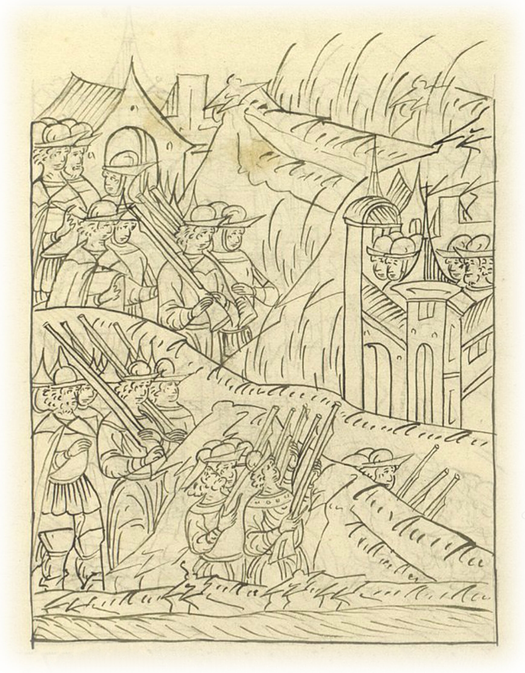 И определили воеводы по государеву наказу, прежде реченному, стрелецкого голову Ивана Ершова со стрельцами и многих атаманов вперед послать; и встали стрельцы и казаки по берегу, и закопались во рвы.
