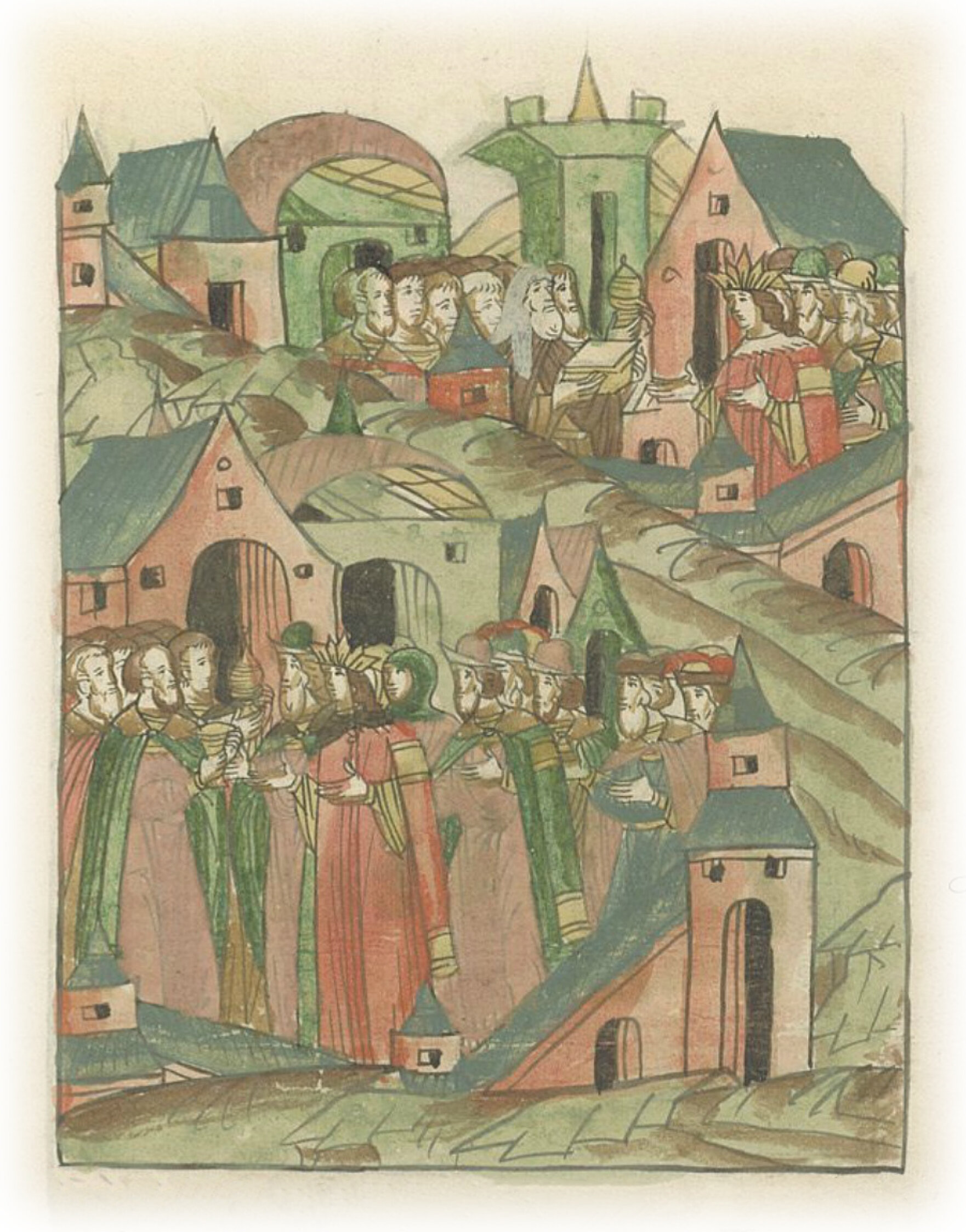 а во Псков пришли (месяца) октября в 11 день; псковичи же воздали честь великую царевне и всем, которые были с нею, и дали дары царевне. А были там 7 дней, а в Новгород въехали (месяца) октября в 25 день, а выехали (месяца) октября в 30 день, от архиепископа и от всего Новгорода приняв честь великую и дары.