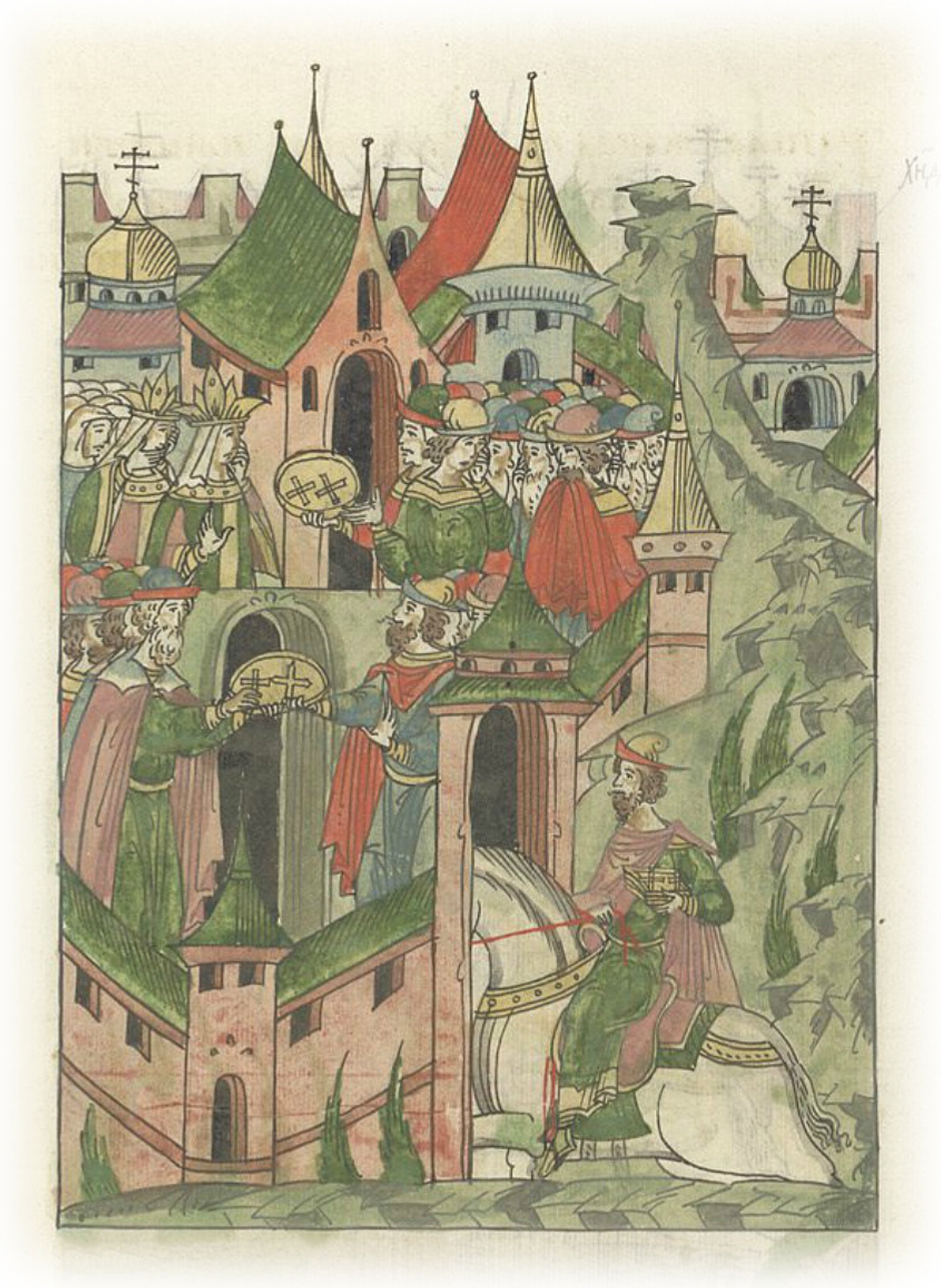 Татарин Ачисан приходит в Москву с нательными крестами великого князя Василия Васильевича.