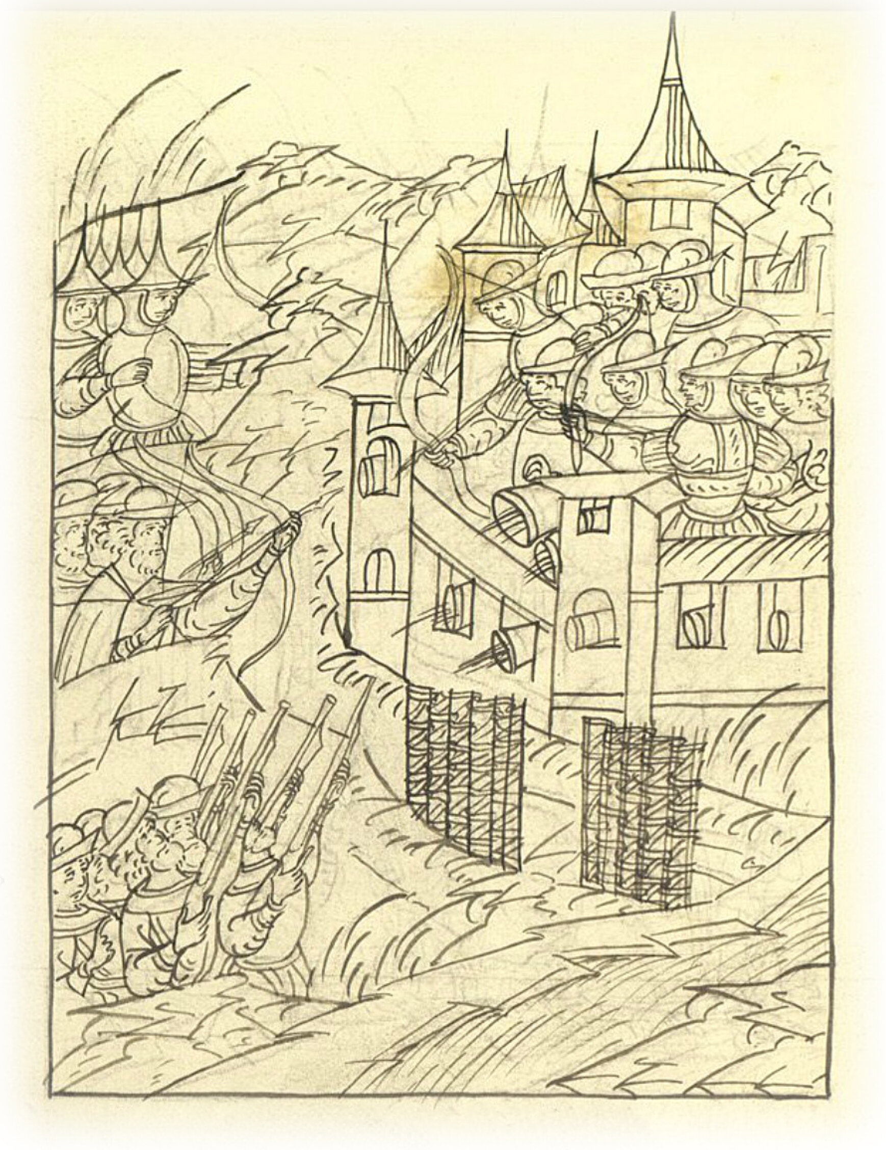Из города же стреляли из пушек и из пищалей, и из луков, а стрельцы в них - из пищалей и казаки - из луков.