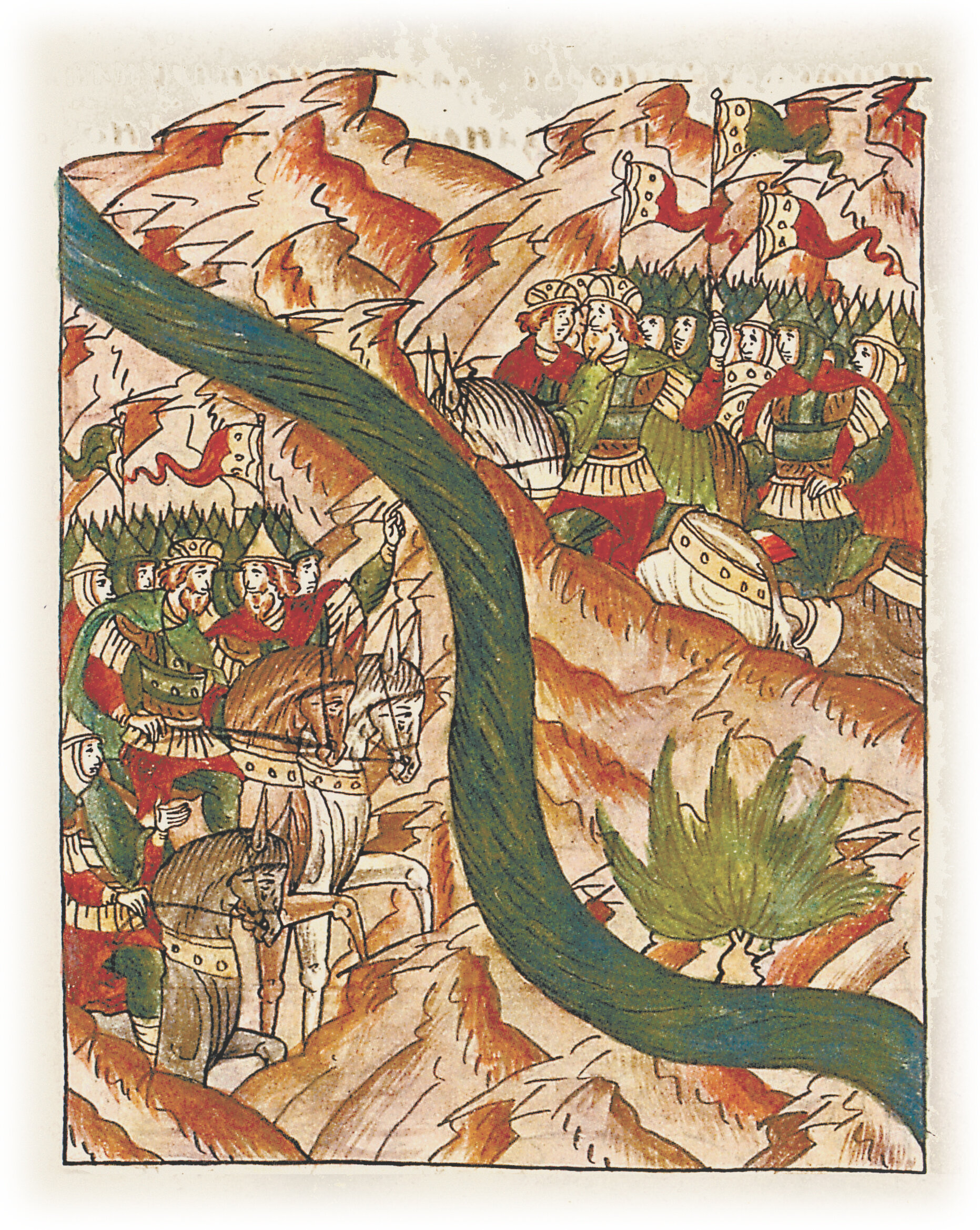 Берендеи и другие воины великого князя Изяслава Мстиславича пугаются огромного войска князя Владимирка Галицкого и уговаривают князя бежать назад.