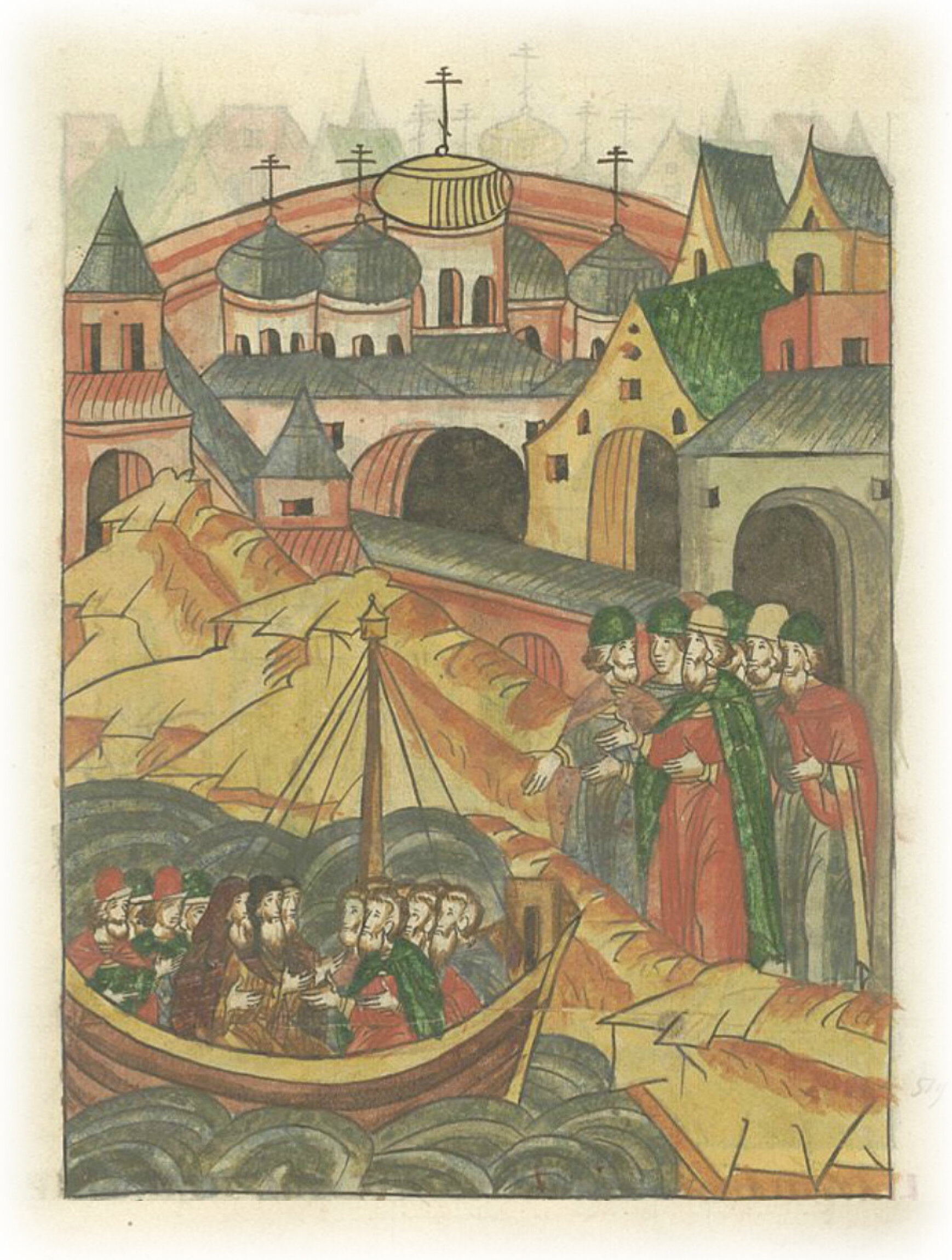 О походе митрополита Пимена в Царьград со Смоленским владыкой Михаилом и Спасским архимандритом Сергием. Русские жители Царьграда приходят к приплывшим чернецам митрополита Пимена и епископов.