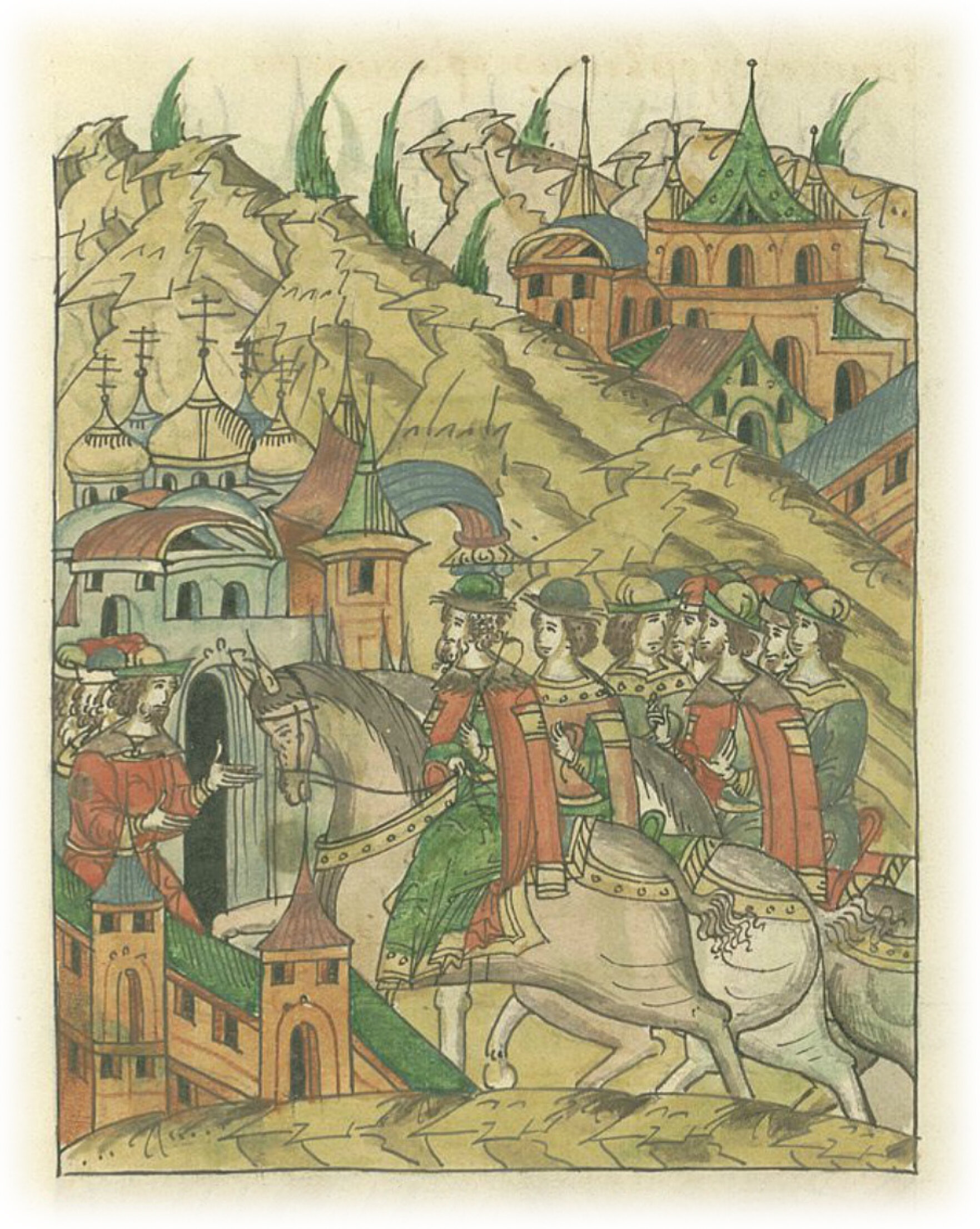 Великий князь Василий Дмитриевич Московский с князем Василием Михайловичем Кашинским выезжает из Орды.