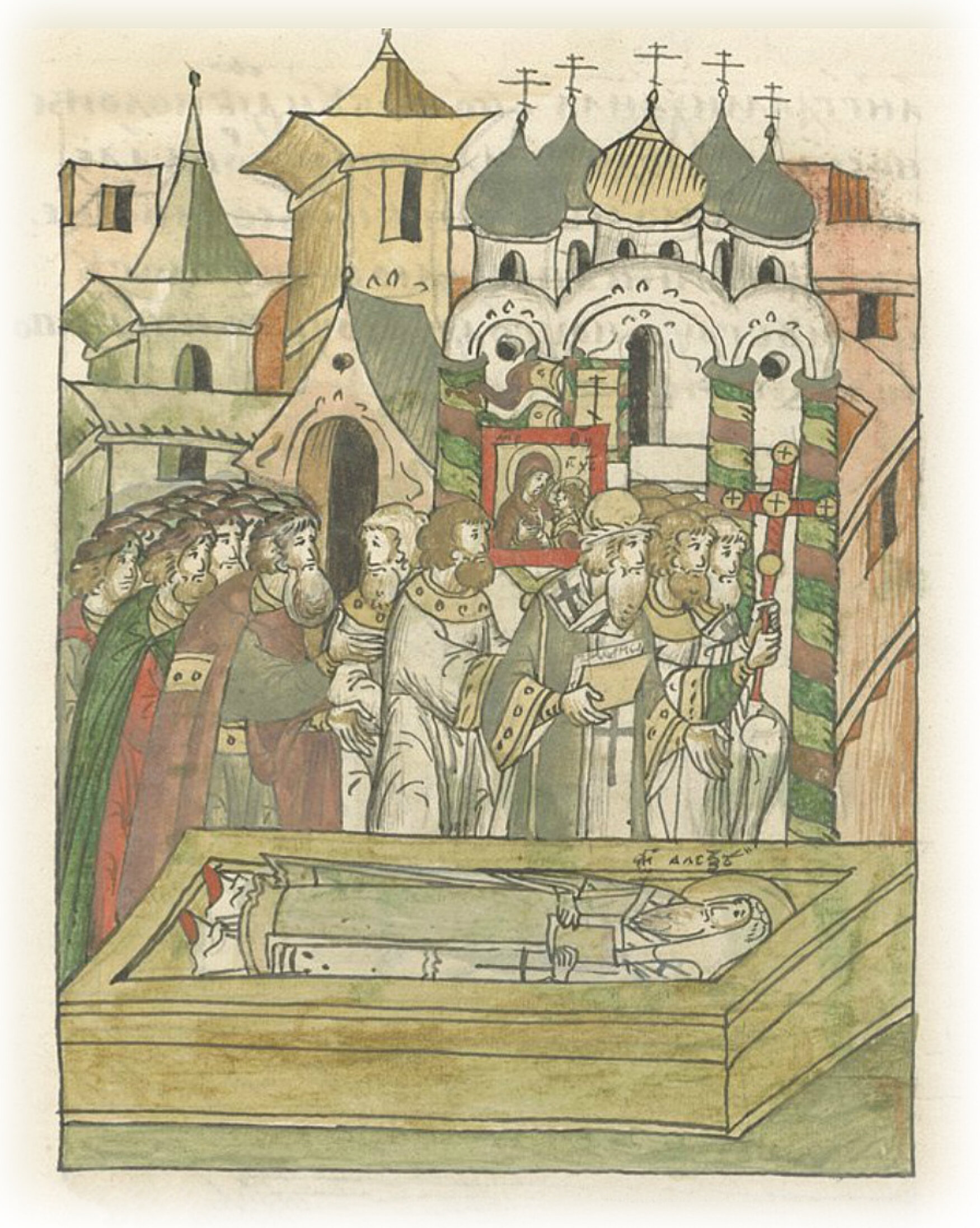 Великий князь Василий Иванович с митрополитом всея Руси Варлаамом приходят в обитель святого архангела Михаила ко гробу святителя Алексия.