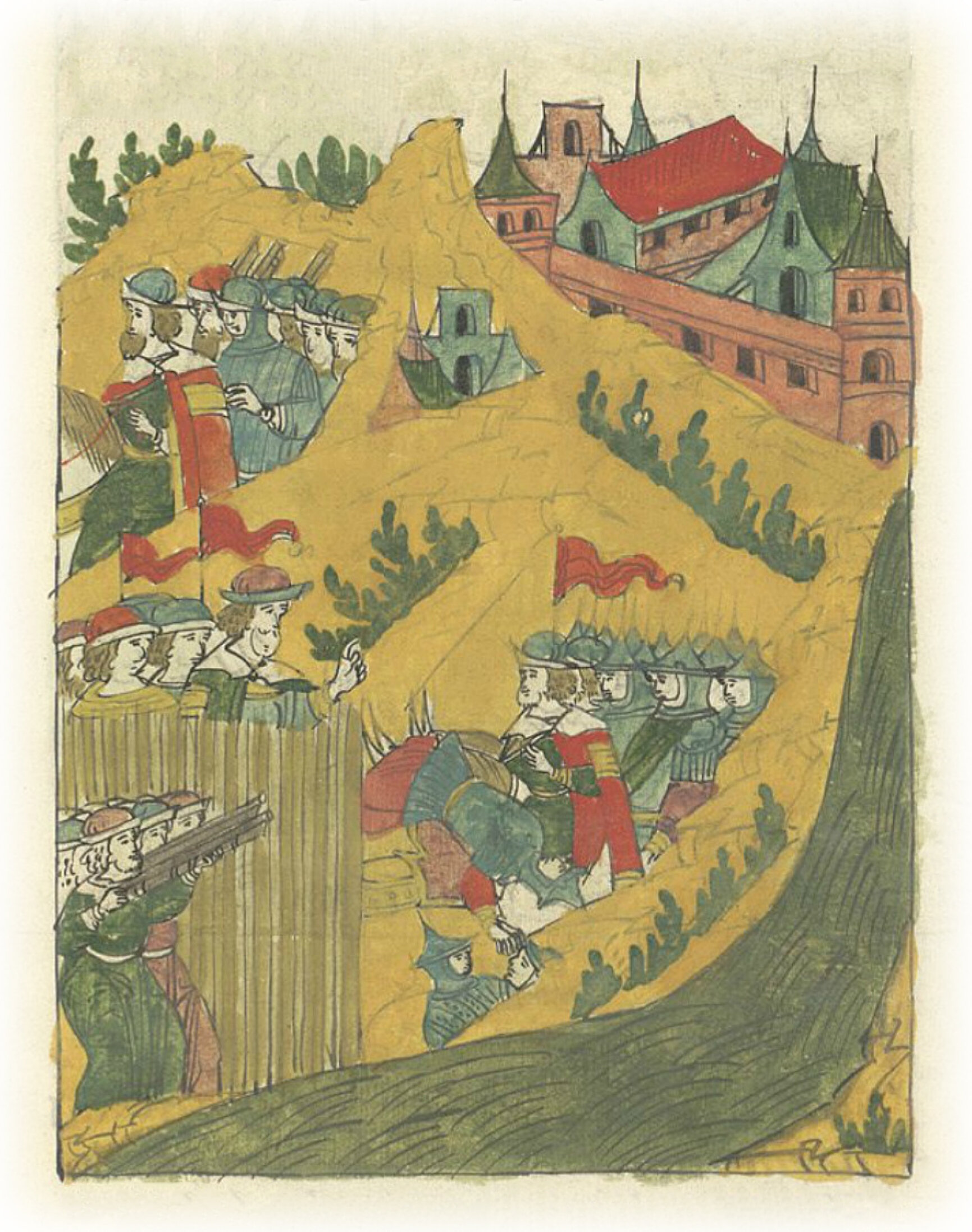 Языки говорят воеводам царя Ивана Васильевича, что магистр окопался большим рвом вокруг города Рындола, бьет из пушек и пищалей и приступает к Рындолу.