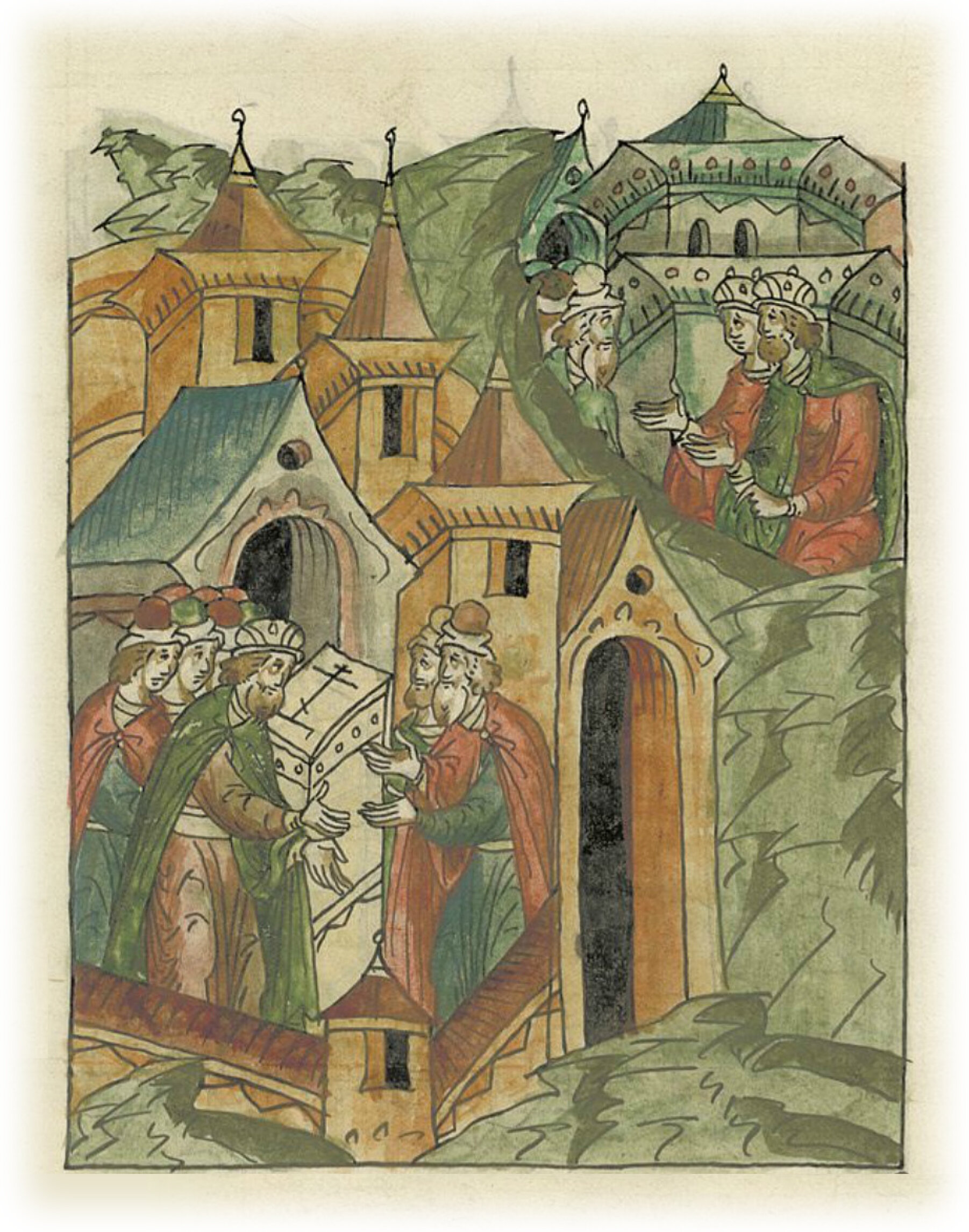 Ругодивские посадники Яким и Захар приезжают в Москву. Воеводы царя Ивана Васильевича Алексей Адашев и Иван Михайлов сообщают им, что государь пожалует их, если сдадут его воеводам помимо Ругодива Вышгород.