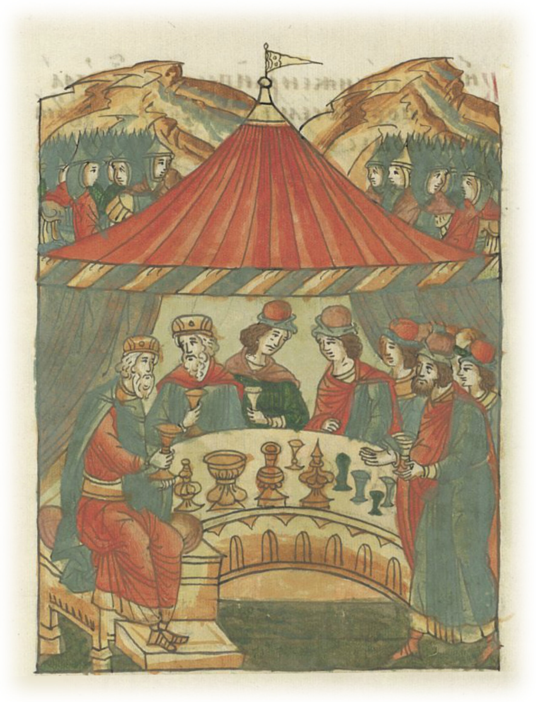 И князь Юрий Всеволодович с братом своим Ярославом Всеволодовичем и с прочими братьями своими рассвирепел и пришел в ярость великую. Он надеялся на силу воинства своего, потому что много воинства собралось, и разъярясь, начали пировать в шатрах своих с боярами своими.