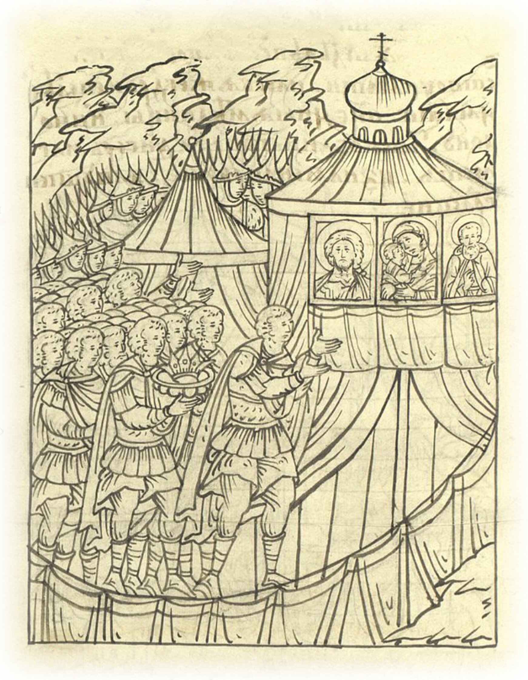 И пришел в церковь Сергия чудотворца, много слез проливая и Богу благодарения воссылая со всем воинством.