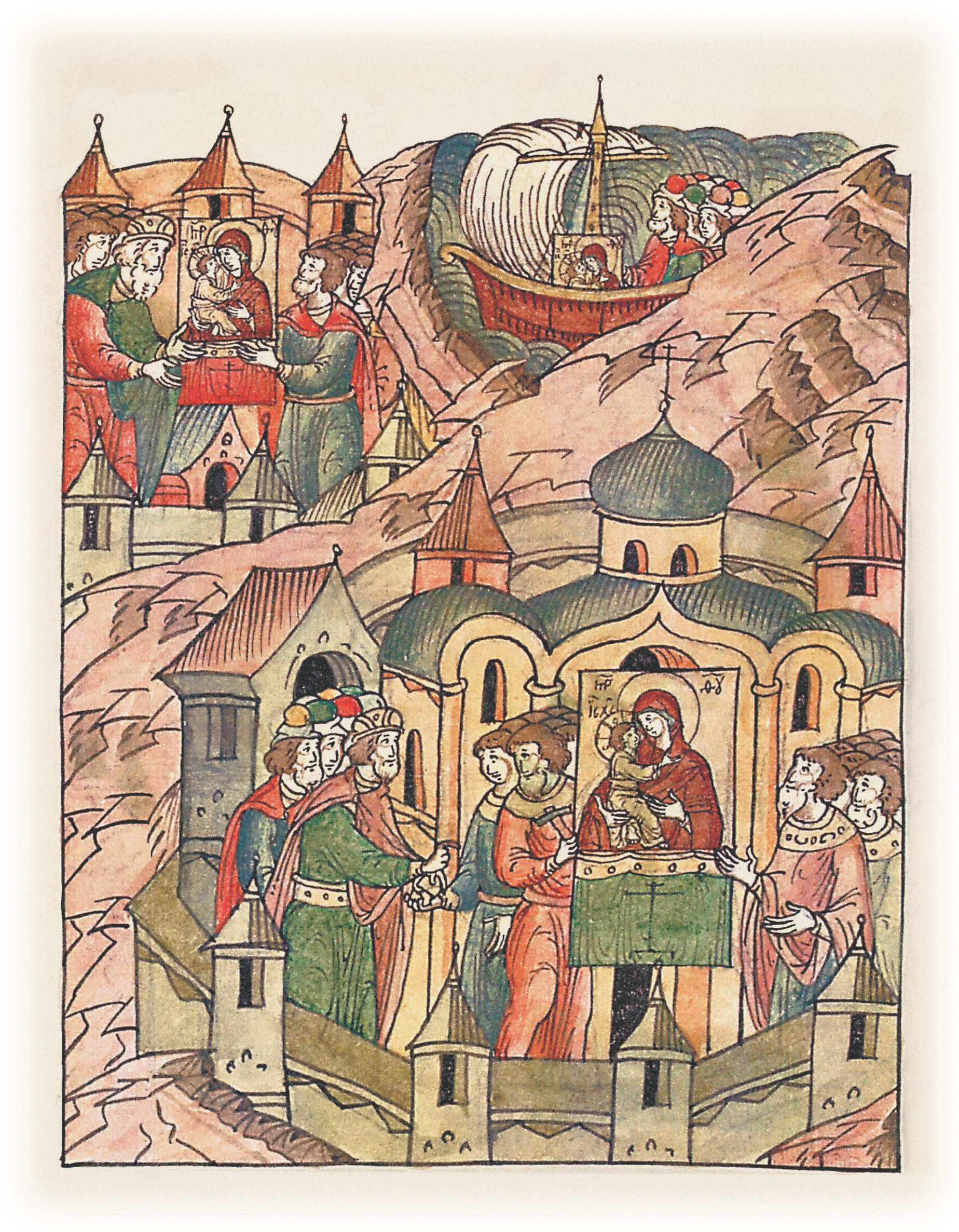 в ней же и чудную икону пречистой Богородицы поставил, о которой говорят, что она письма Луки евангелиста, и которую к отцу его в Киев привезли в корабле с Пирогощею из Царьграда; взял он ее из Киева и принес от отца своего, и возложил на нее золота более тридцати гривенок, кроме серебра, и камения дорогого, и жемчуга.