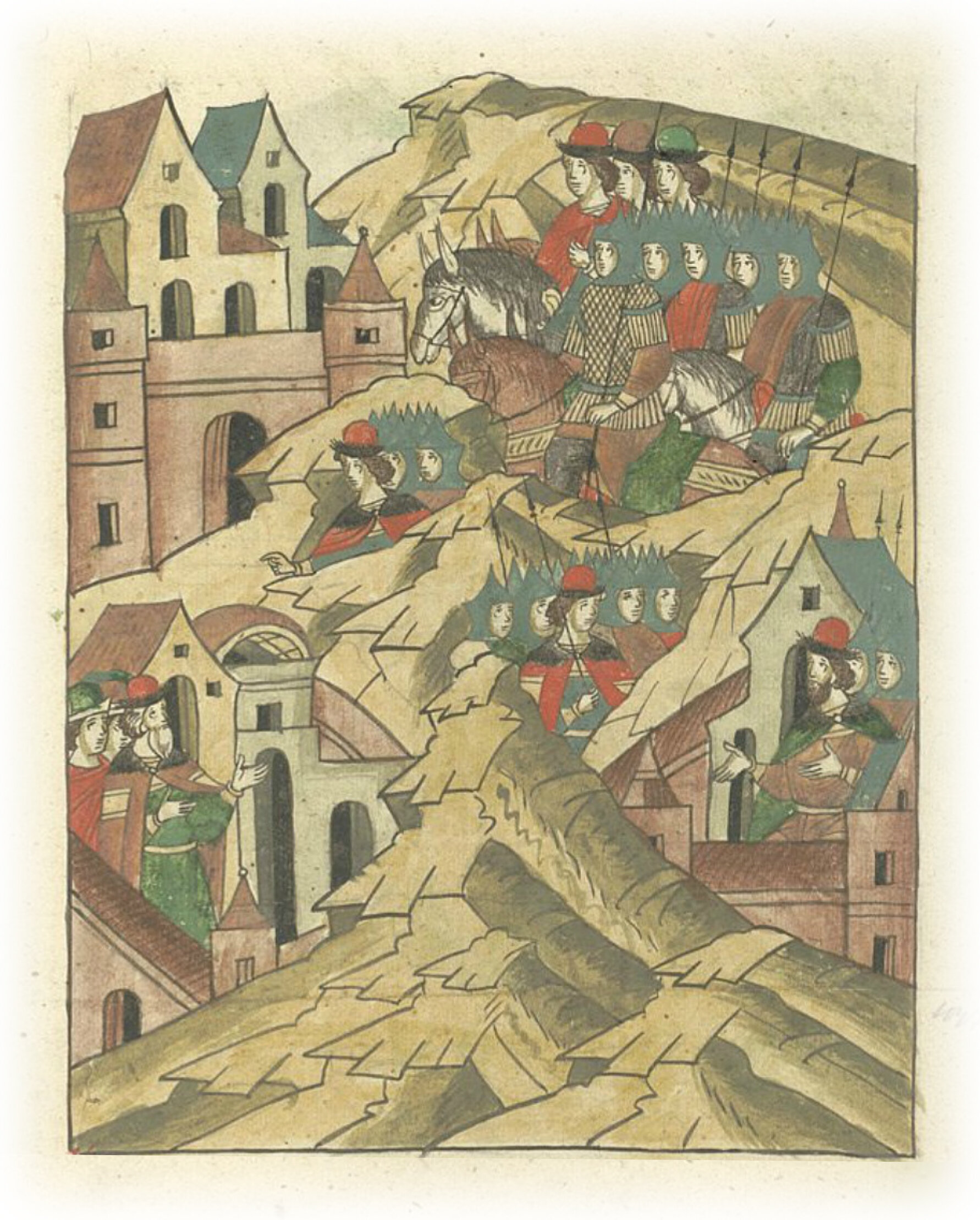 Языки говорят воеводам царя Ивана Васильевича, что магистр окопался большим рвом вокруг города Рындола, бьет из пушек и пищалей и приступает к Рындолу.