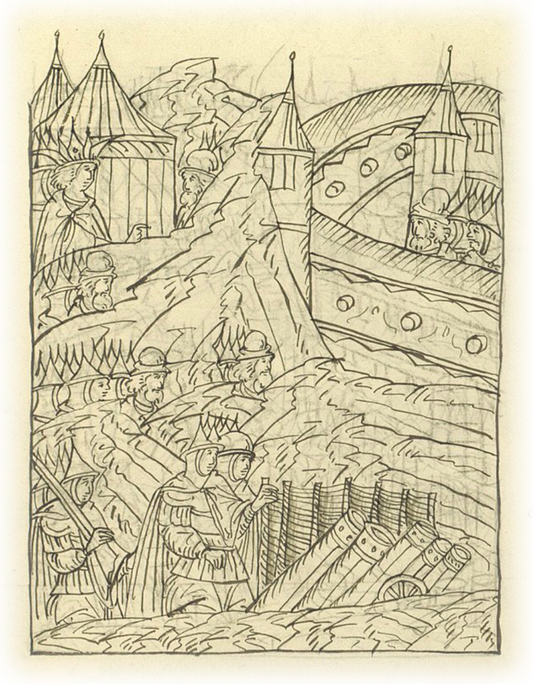 Языки говорят воеводам царя Ивана Васильевича, что магистр окопался большим рвом вокруг города Рындола, бьет из пушек и пищалей и приступает к Рындолу.
