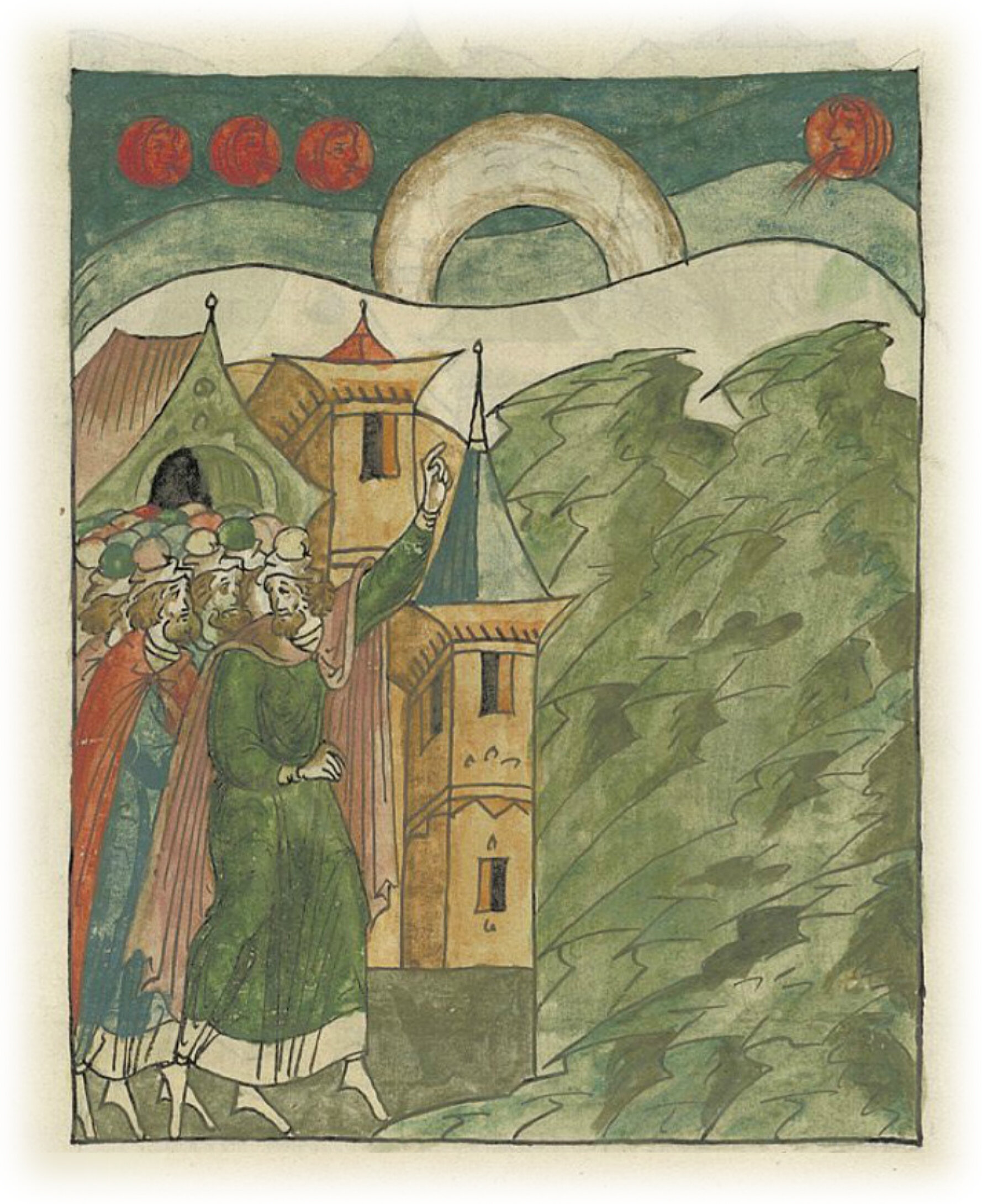 Той же зимой было знамение на небе: появились три солнца на востоке, а четвертое – на западе, а посреди небес – будто месяц большой, подобный дуге, и продолжалось это знамение с утра до полудня, все люди смотрели и удивлялись.