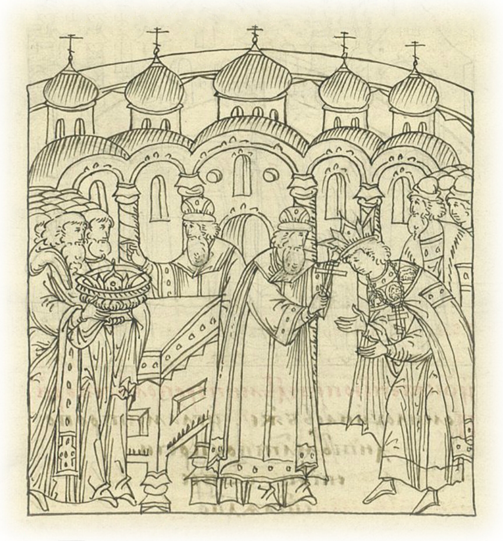 Возглас. «Ты, Царь мира и Спаситель душ наших и Тебе славу воссылаем Отцу и Сыну и Святому Духу». И после «Аминь» велел митрополит принести к себе шапку с аналоя тем же двум архимандритам, и митрополит взял шапку, то есть венец, и перекрестил великого князя крестом, говоря: «Во имя Отца и Сына и Святого Духа» и положил на него шапку.