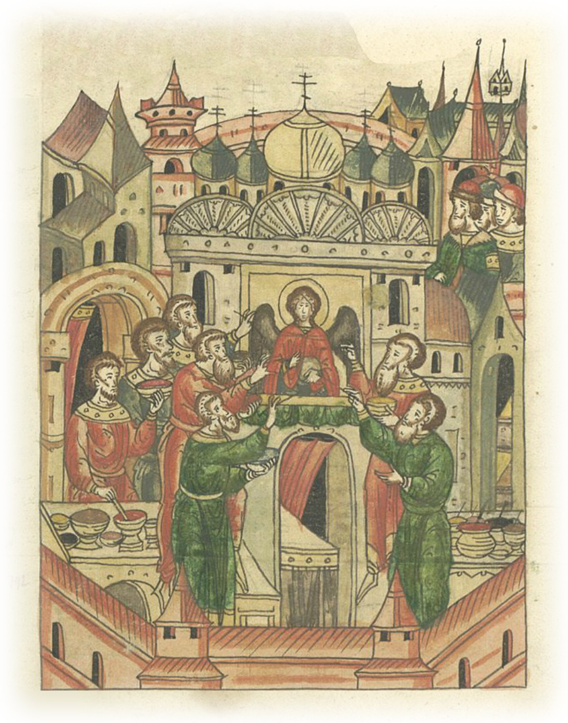 А другую церковь у великого князя на дворе, церковь святого архангела Михаила, великий князь Семен Иванович велел расписать русским иконописцам. Старейшины и начальники у них были: Захария, Денисей, Иосиф, Николай и прочая артель их. И в том году работу не успели закончить из-за большого объема и мелкого письма.