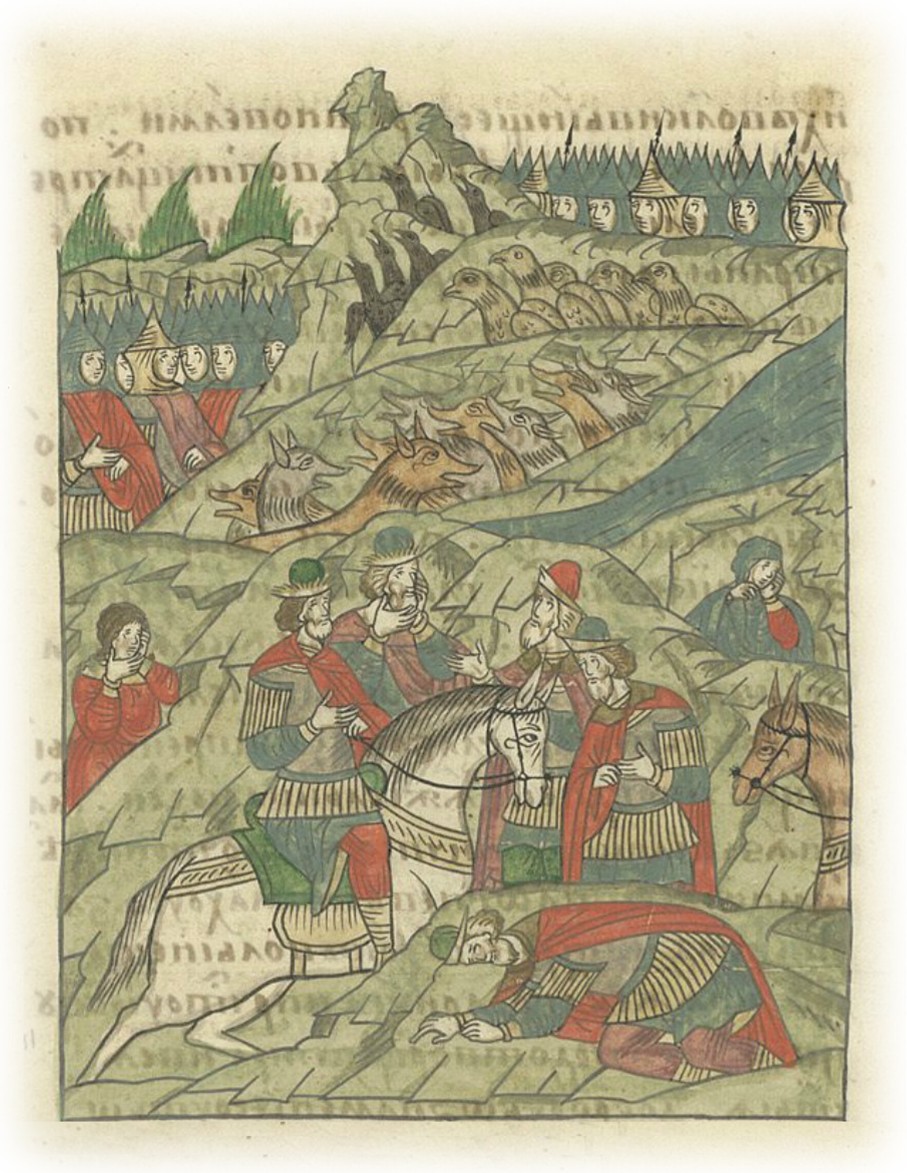 И еще у меня есть примета иная». И сошел с коня, и пал на правое ухо, приник к земле и лежал долгое время, и встал, и вдруг поник. Сказал ему князь великий: «Что с тобой, брат Дмитрий, поведай мне?» Дмитрий же не хотел сказать ему и много сопротивлялся. Князь же великий снова приступил к нему, моля его, чтобы сказал ему. Он же прослезился. Князь же великий, увидев слезы его, начал бояться и сказал ему: «Брат Дмитрий, поведай мне. Поскольку болезнует мое сердце очень». Дмитрий же начал утешать его и сказал ему: «Господине княже, поведаю тебе одному. Но ты не поведай никому. Ибо есть две вести. Одна тебе на великую радость, а другая на великую скорбь. Припал я ухом на землю и услышал землю, плачущую на два голоса, горько очень и страшно. Одна сторона, словно некая жена, надрывно плачущая, дерзающая и кричащая татарским языком о чадах своих, бьющаяся и слезы изливающая, словно реки. А другая сторона земли, словно некая девица, плачущая и стонущая, будто свирельным плачевным голосом, в скорби и в печали великой. Я ведь множество тех боев и примет испытал на многих битвах, и знакомы мне они, и понятны; и уповай на милость Божию, ибо одолеть должен ты татар. А воинства твоего падет от острия меча многое множество». Тогда князь великий Дмитрий Иванович, такую повесть услышав, проплакался очень, и прослезился на многое время, и сказал: «Воля Господня да будет. Как угодно будет Господу, так и будет. Ибо воле Его кто воспротивится?» Сказал ему Дмитрий Боброк Волынец: «Господине княже, не подобает тебе этого в полках поведать никому же, чтобы не впали в скорбь и не уныли сердца многих. Но с верою и с милостынею призывай Господа Бога на помощь, и Пречистую Богородицу, и великого чудотворца Петра, и всех святых, и вооружайся животворящим крестом Христовым, ибо тот есть великое оружие непобедимое на врагов видимых и невидимых». Волки же страшно всю ночь воющие, и такое их было множество, словно со всей вселенной сошлись, и вороны, каркающие и кричащие, и орлы, клекочущие страшно очень всю ночь.