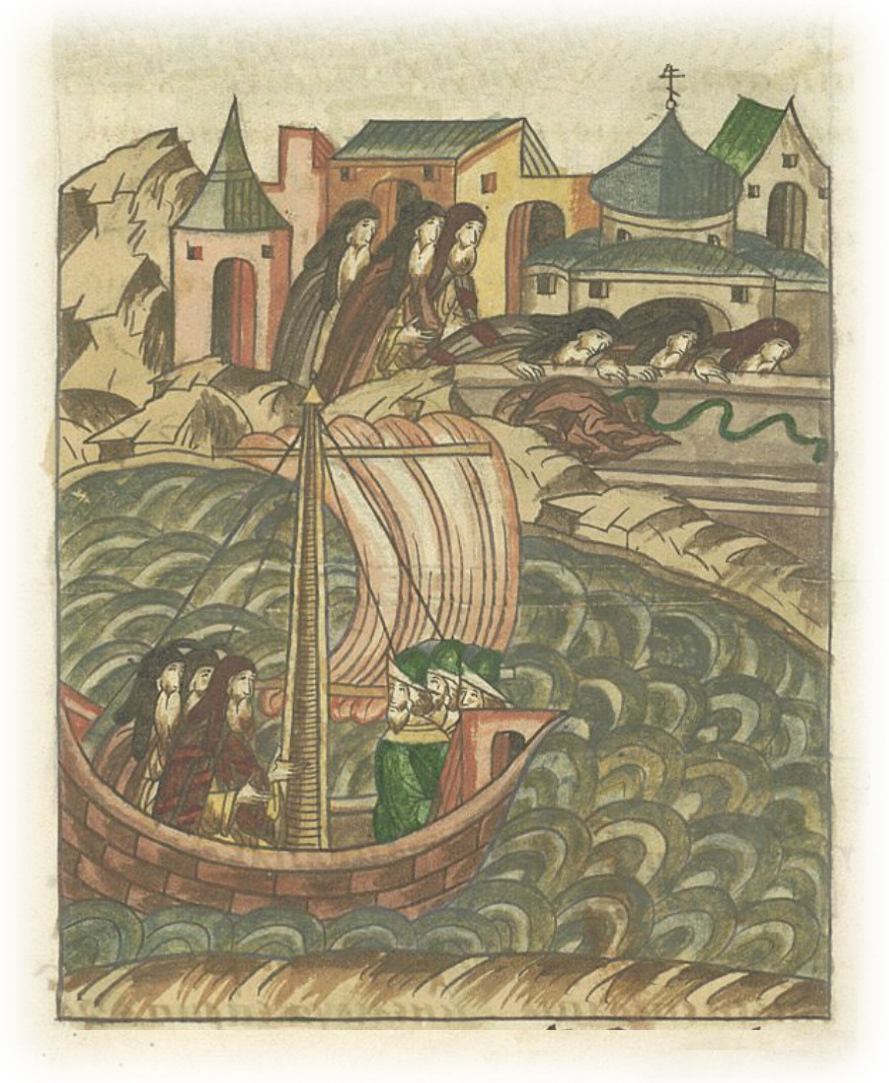 О походе митрополита Пимена в Царьград со Смоленским владыкой Михаилом и Спасским архимандритом Сергием. Чернецы митрополита Пимена и епископов кланяются святыням Царьграда.