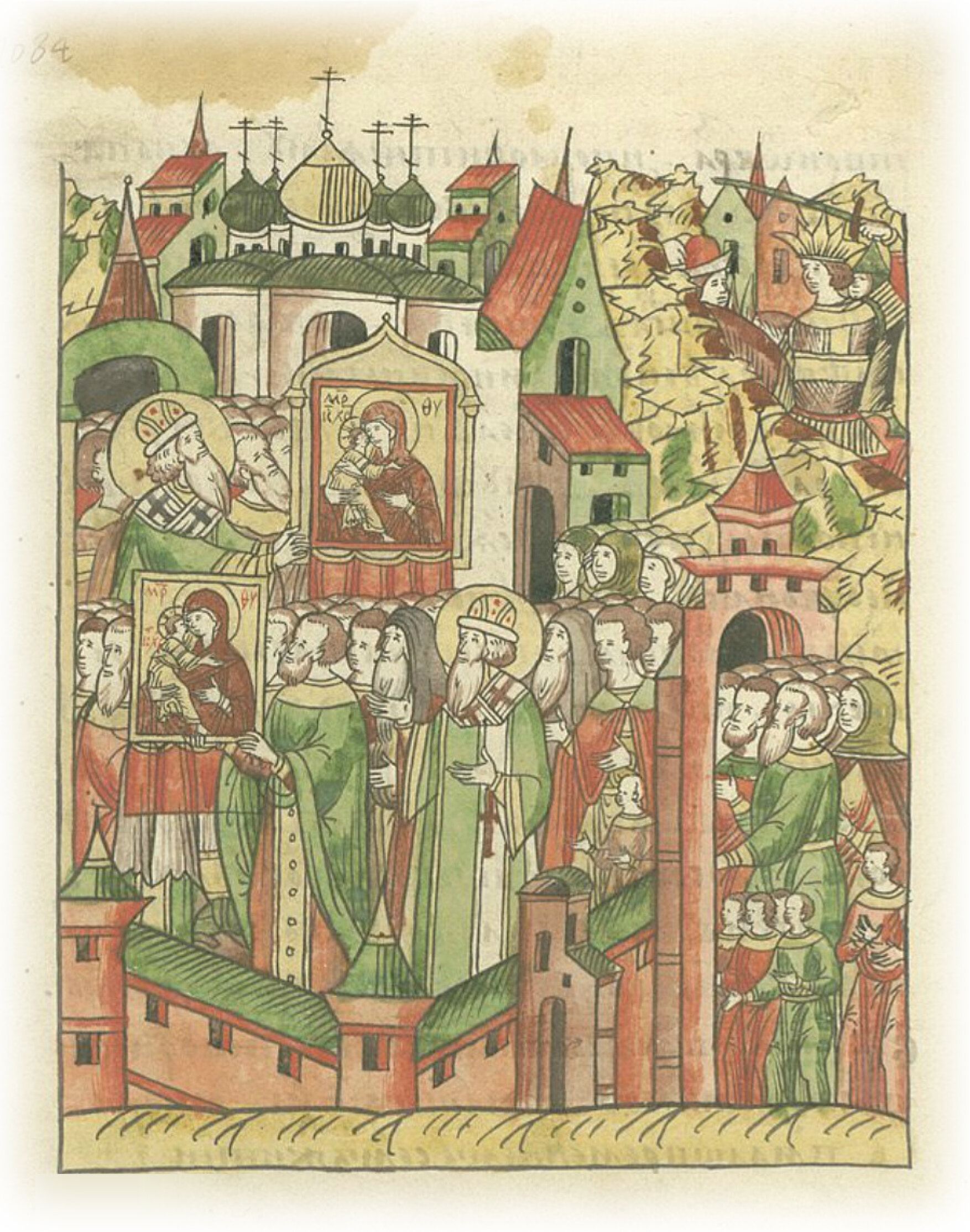 О поставлении чудотворной иконы Богоматери в Москве в соборной церкви честного Ее Успения. Итак, вознося ей многие благодарения, шествовали к городу с иконой Богоматери. Внесли ее в знаменитый храм славного ее Успения, который являлся великой соборной и апостольской церковью Русской митрополии, и поставили ее в киоте на правой стороне, где и доныне стоит зримая, которой все поклоняются, и которая творит бесчисленные чудеса; которая является заступницей и хранительницей от всяких бед царствующего города Москвы, и всех городов Русской державы, и всего христианского достояния. Темир-Аксак тогда стоял в Рязанской земле уже пятнадцать дней и все опустошил по Божьему попущению. И оттуда неуклонно собирался пленить всю Русскую землю и все христианское человечество замучить, и предать мечу. Но не допустила этого десница Вышнего Промысла. Кто может рассказать о неизреченных щедротах и человеколюбии Божием, о заступничестве и милости пречистой Его Матери к роду христианскому!