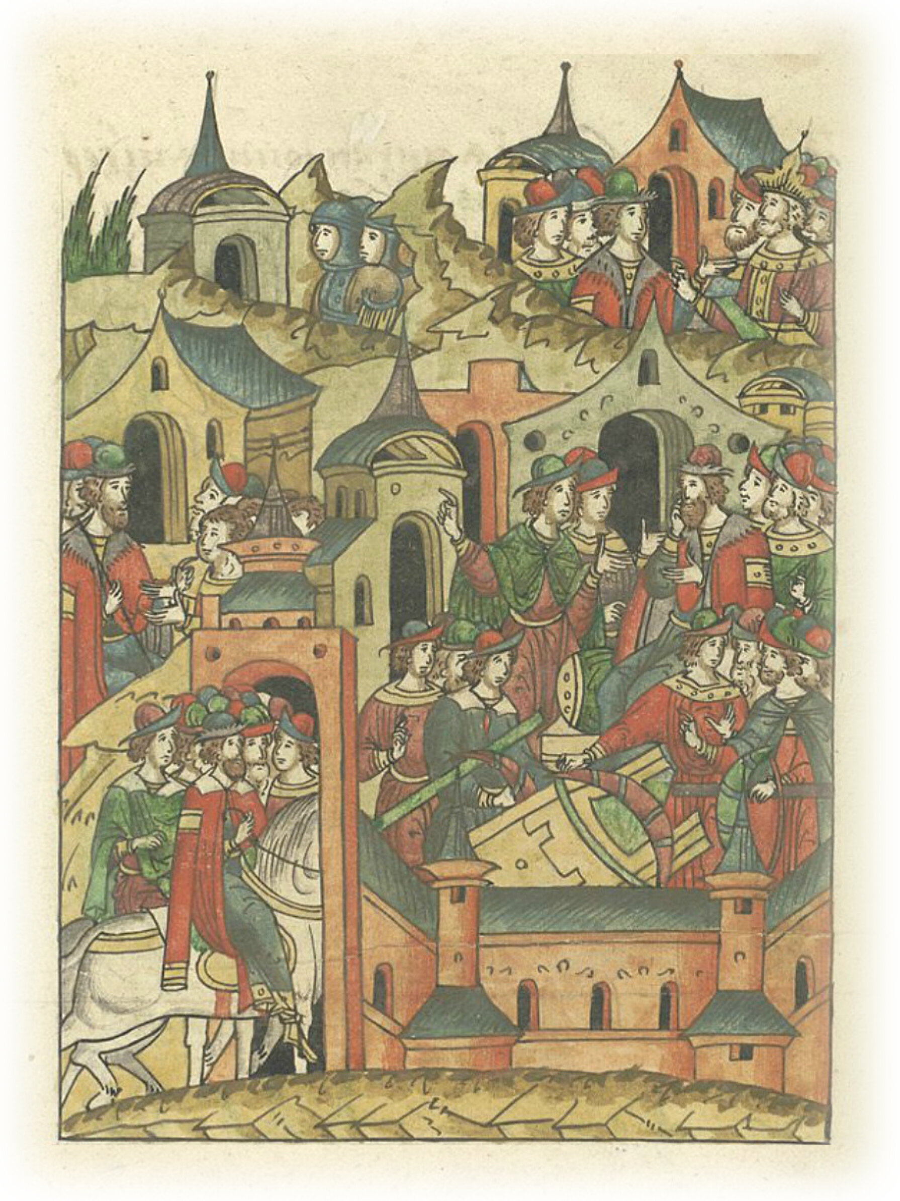 И оттуда призвали его новгородцы к себе в Новгород по крестному целованию, поскольку было им тогда притеснение от немцев, ибо воевали тогда немцы на новогородские волости; и начали стенобитные орудия чинить, хотя идти с великим князем Юрием Даниловичем на немцев. А князю Юрию Даниловичу тогда была самому печаль от князя Дмитрия Михайловича Тверского, который в Орде у царя Азбяка испросил великое княжение на Руси Владимирское.