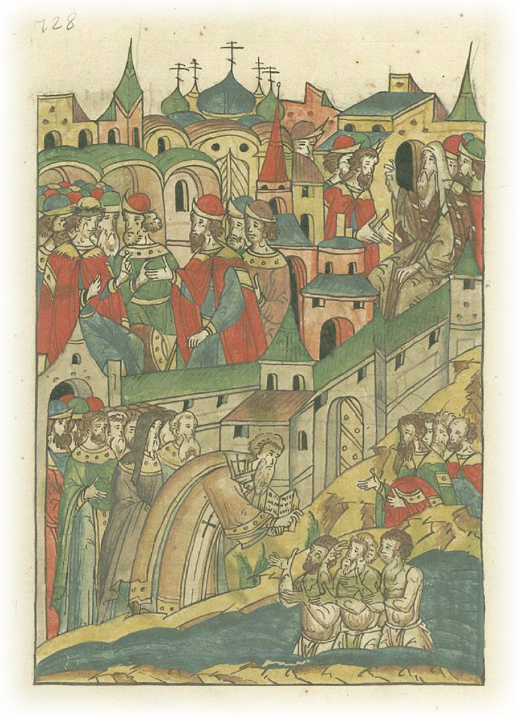 Митрополит всея Руси Киприан крестит троих татар, желающих принять христианскую веру.