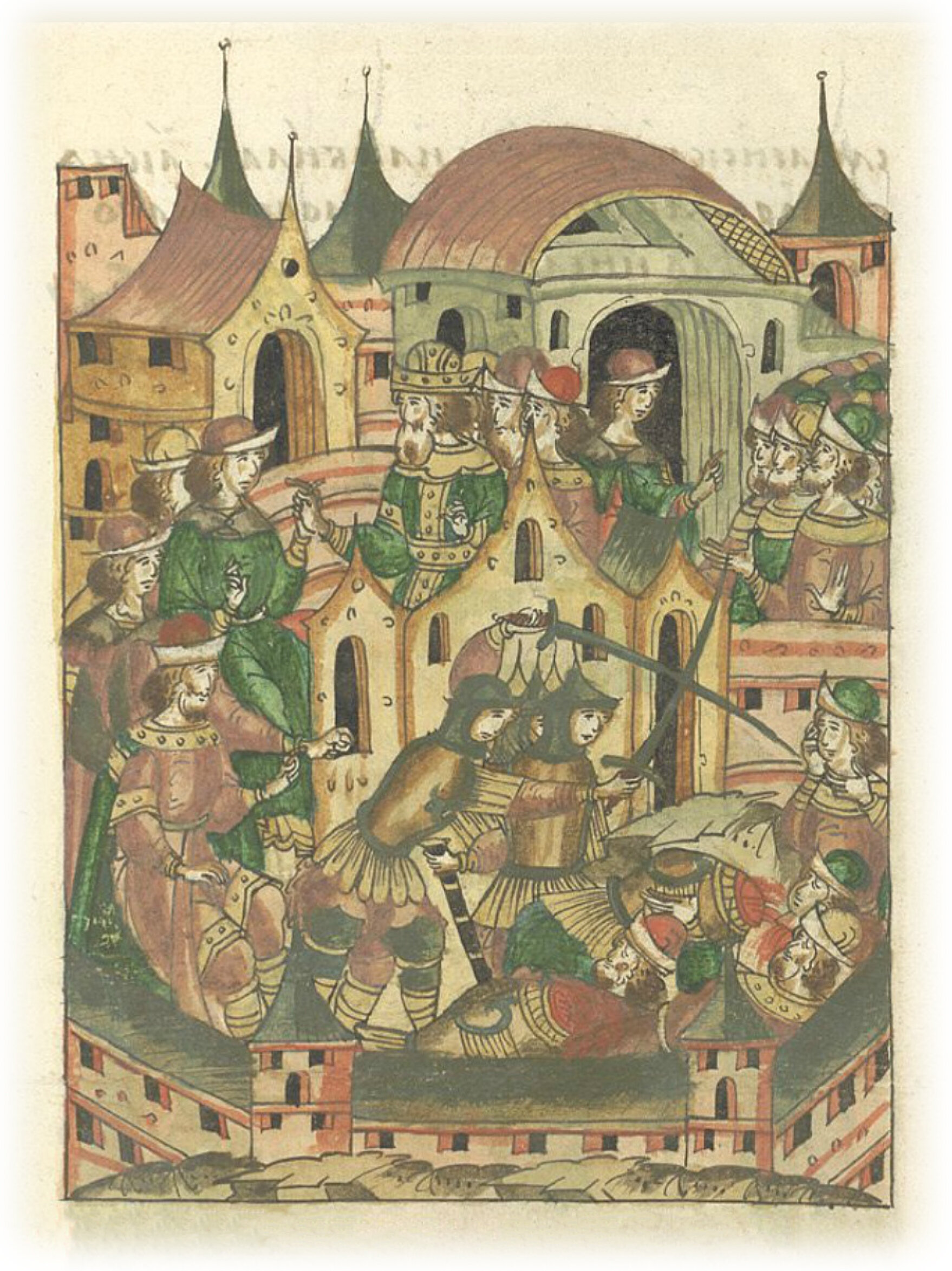 И князей, и смоленских бояр пленил и отослал в Литву, а некоторых предал смертной казни, тех, которые выступали против него. А в Смоленске посадил своими наместниками ляхов и приказал им держать город в повиновении, смоленским же людям дать послабление, чтобы отвратить их от князя Юрия Святославича Смоленского, чтобы Витовта вся земля Смоленская полюбила и захотела, а от князя Юрия Святославича Смоленского отказалась.