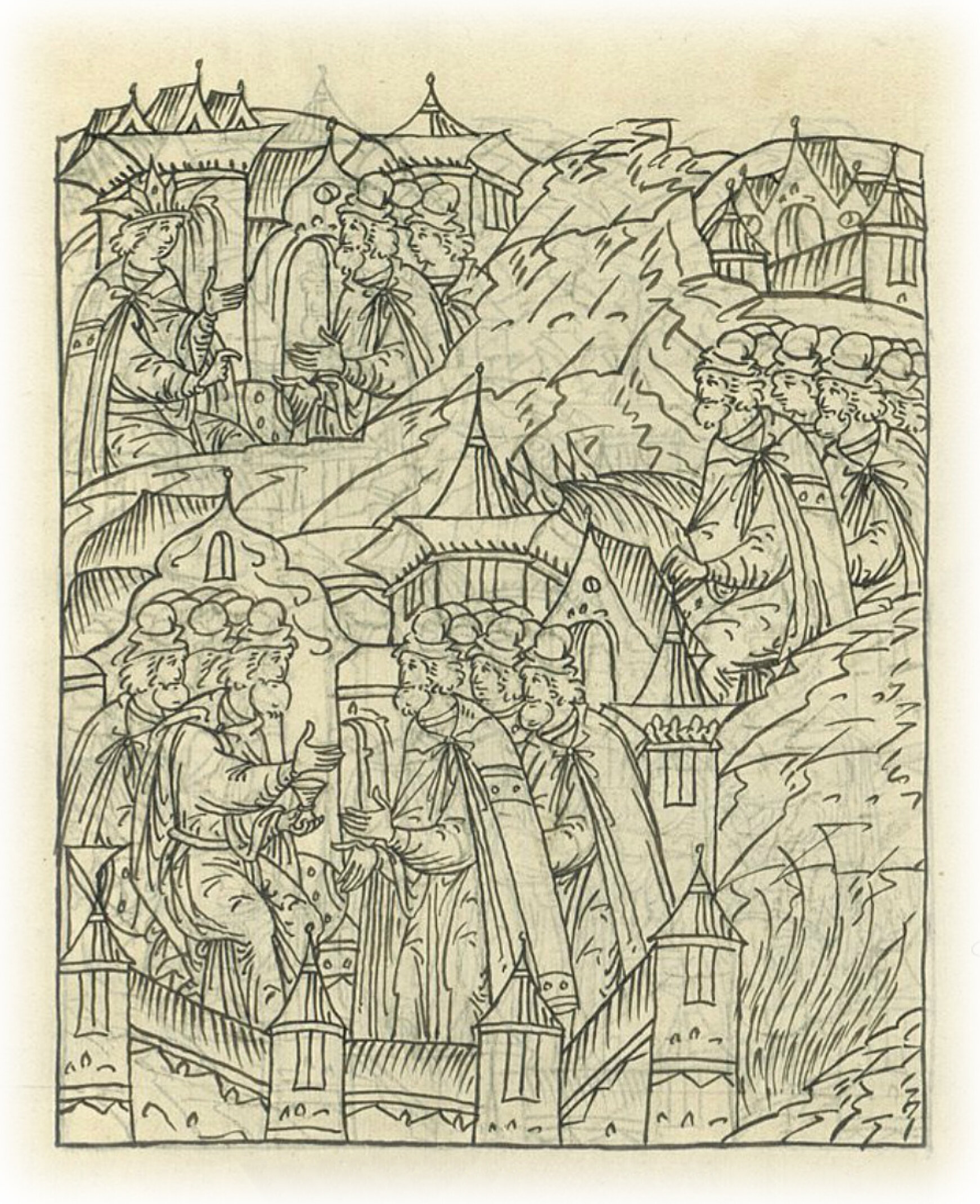 Языки говорят воеводам царя Ивана Васильевича, что магистр окопался большим рвом вокруг города Рындола, бьет из пушек и пищалей и приступает к Рындолу.