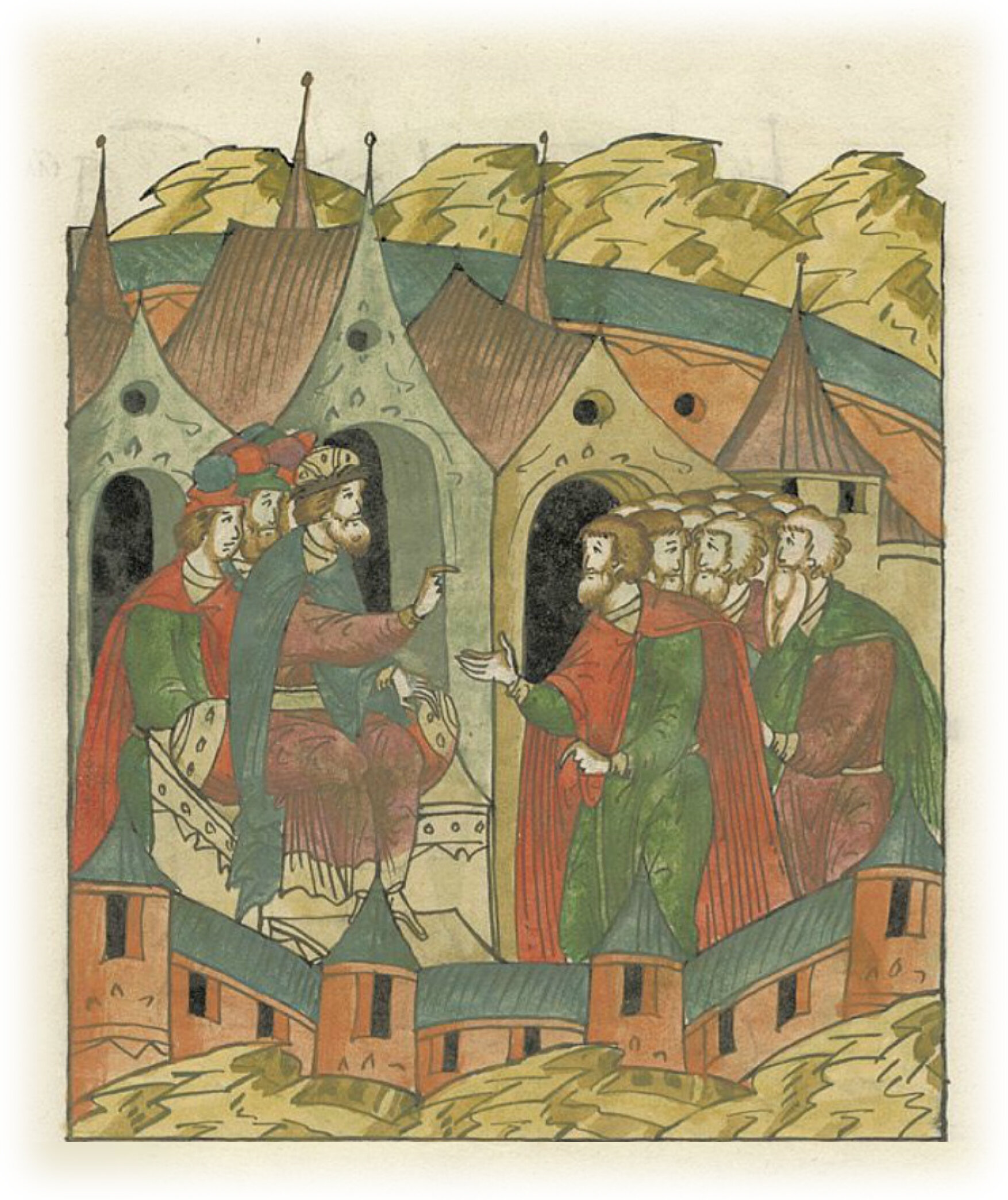 Ругодивские посадники Яким и Захар приезжают в Москву. Воеводы царя Ивана Васильевича Алексей Адашев и Иван Михайлов сообщают им, что государь пожалует их, если сдадут его воеводам помимо Ругодива Вышгород.