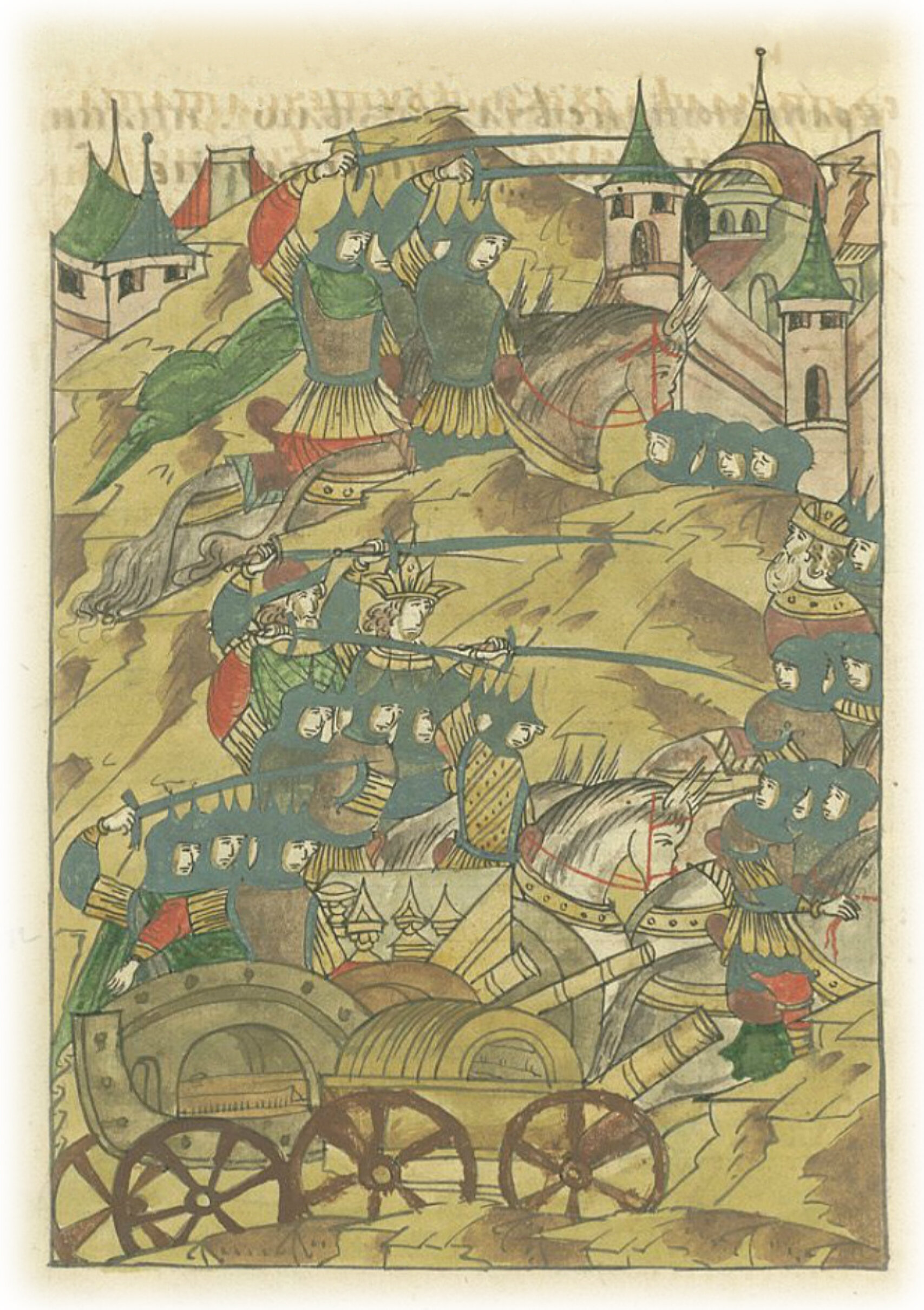 И захватили татары обоз и телеги, окованные железными цепями, и пушки, и пищали, и самострелы, много богатства, золотые и серебряные сосуды. Витовт Кейстутович, увидев такое зло, обратился в бегство вместе с малой дружиной, татары бросились им вслед и настигли их за пятьсот верст до Киева, и пролилась кровь, как вода.