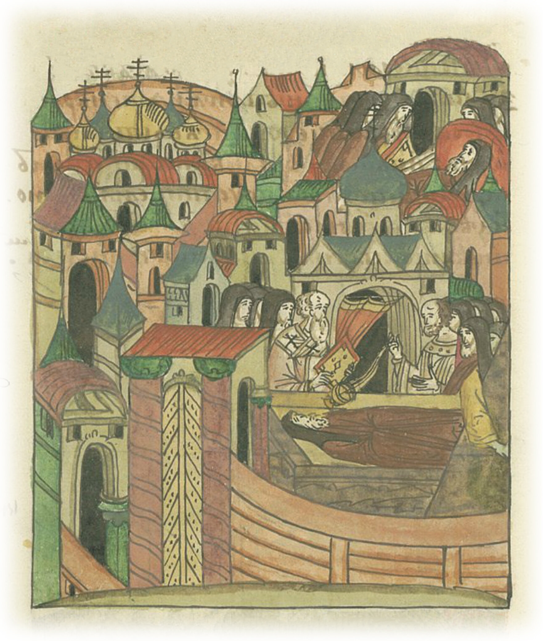 Кончина Иоакима, архидьякона Новгородского владыки, и его похороны в монастыре Иоанна Златоуста за стенами Москвы.