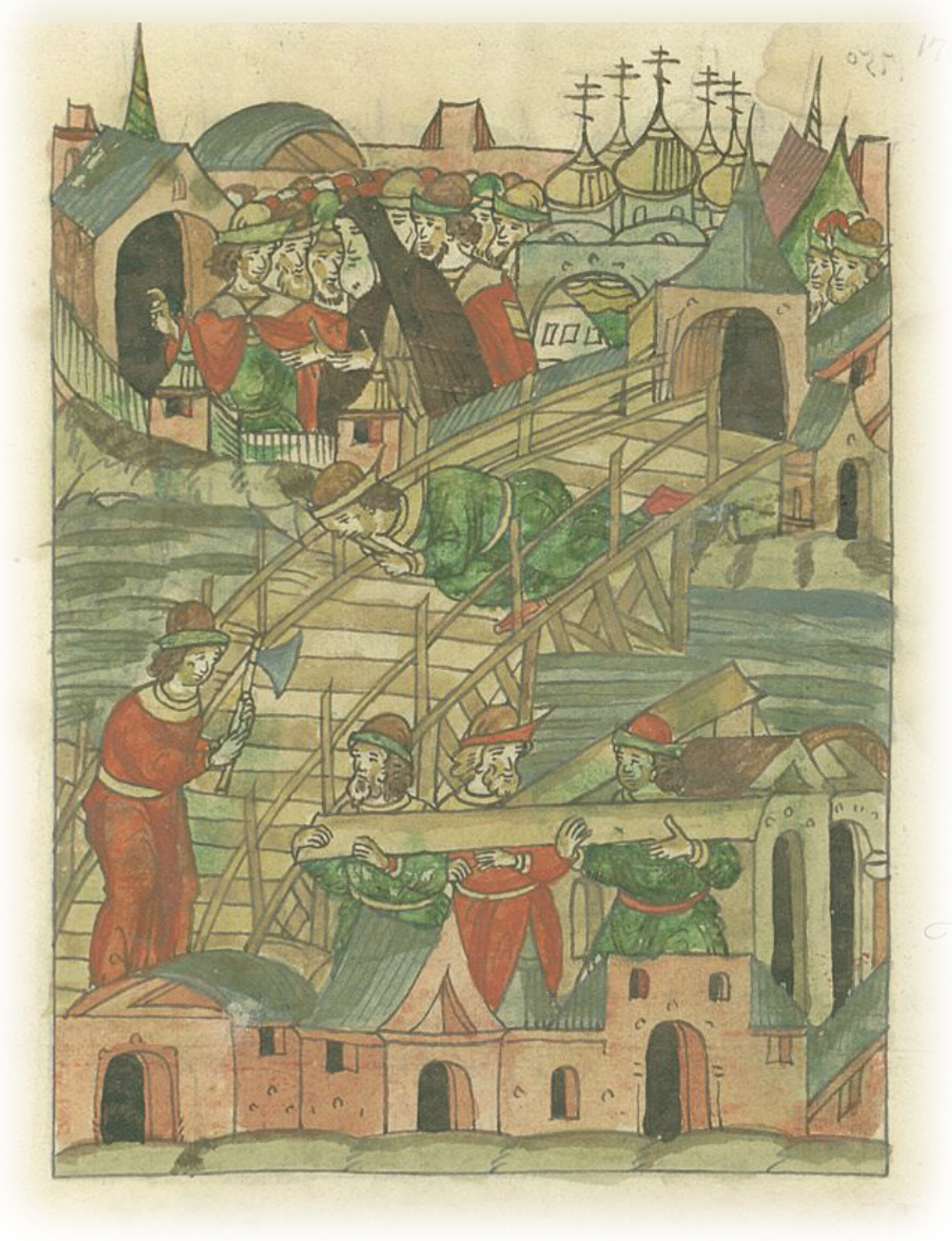 Новгородцы призывают на архиепископский двор выбранного по жребию Феодосия, Троицкого игумена из Клопска. Строительство большого моста в Новгороде.