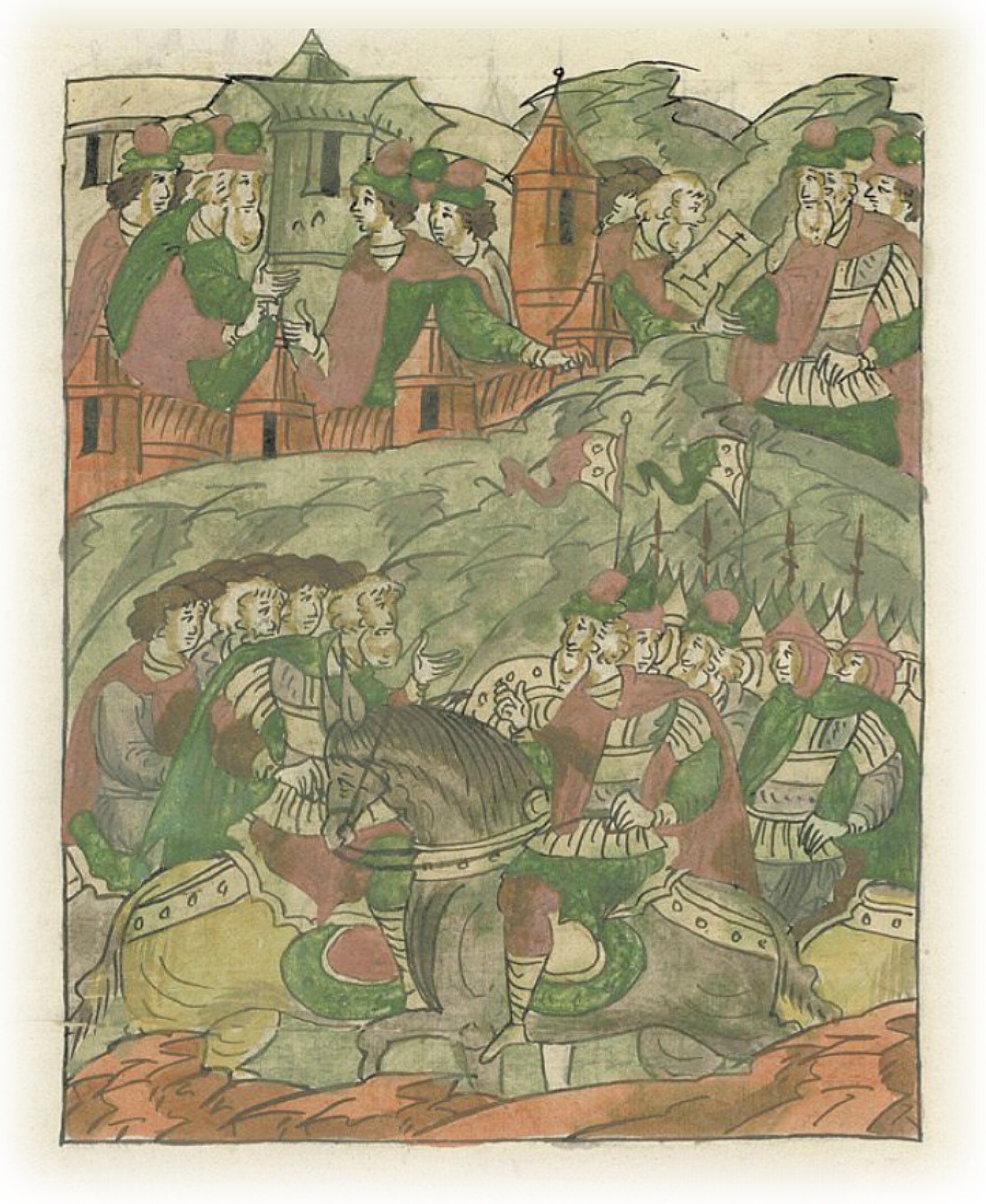 И князь Михаил, услышав о приходе воевод великого князя, встретил их и бил челом, чтобы государь великий князь пожаловал, взял его к себе на службу с его вотчиною, и крест воеводам на том целовал со всеми людьми своими,
