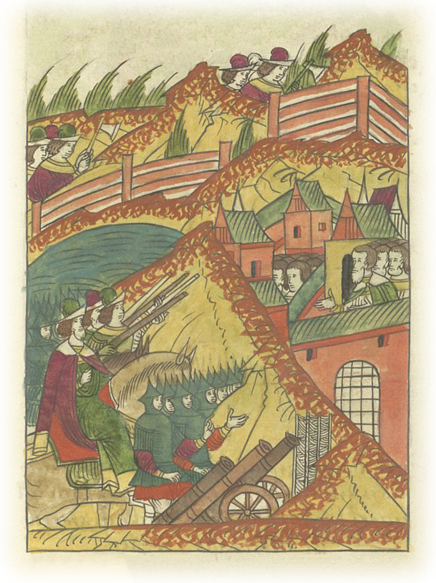 Языки говорят воеводам царя Ивана Васильевича, что магистр окопался большим рвом вокруг города Рындола, бьет из пушек и пищалей и приступает к Рындолу.