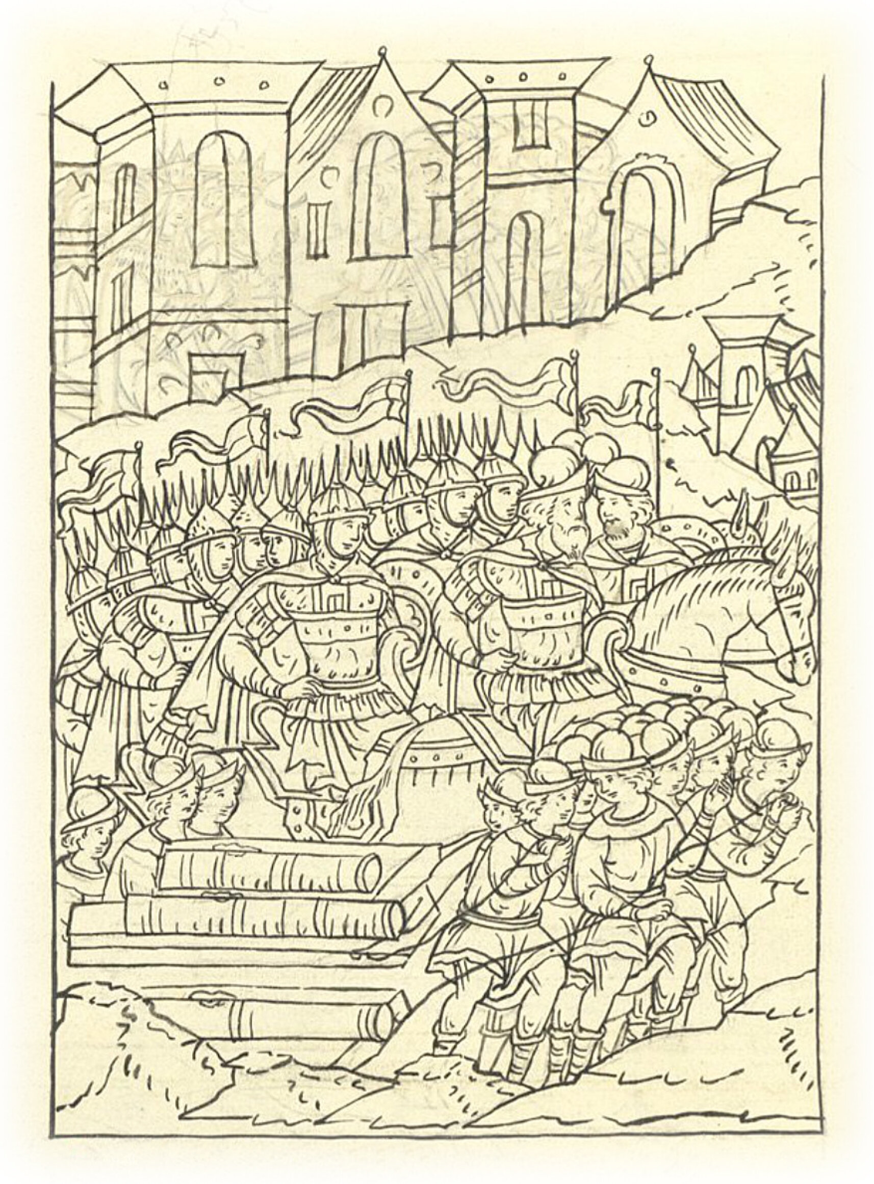 А велел князь великий воеводам своим князю Василию Васильевичу Шуйскому с товарищами идти от Смоленска против литовских людей; а не будет против них литовских людей, и князю Василию с товарищами идти с нарядом – с пушками и с пищалями к Мстиславлю и Мстиславль осаждать.
